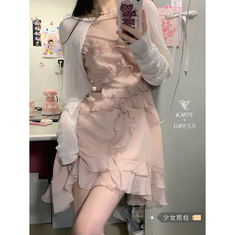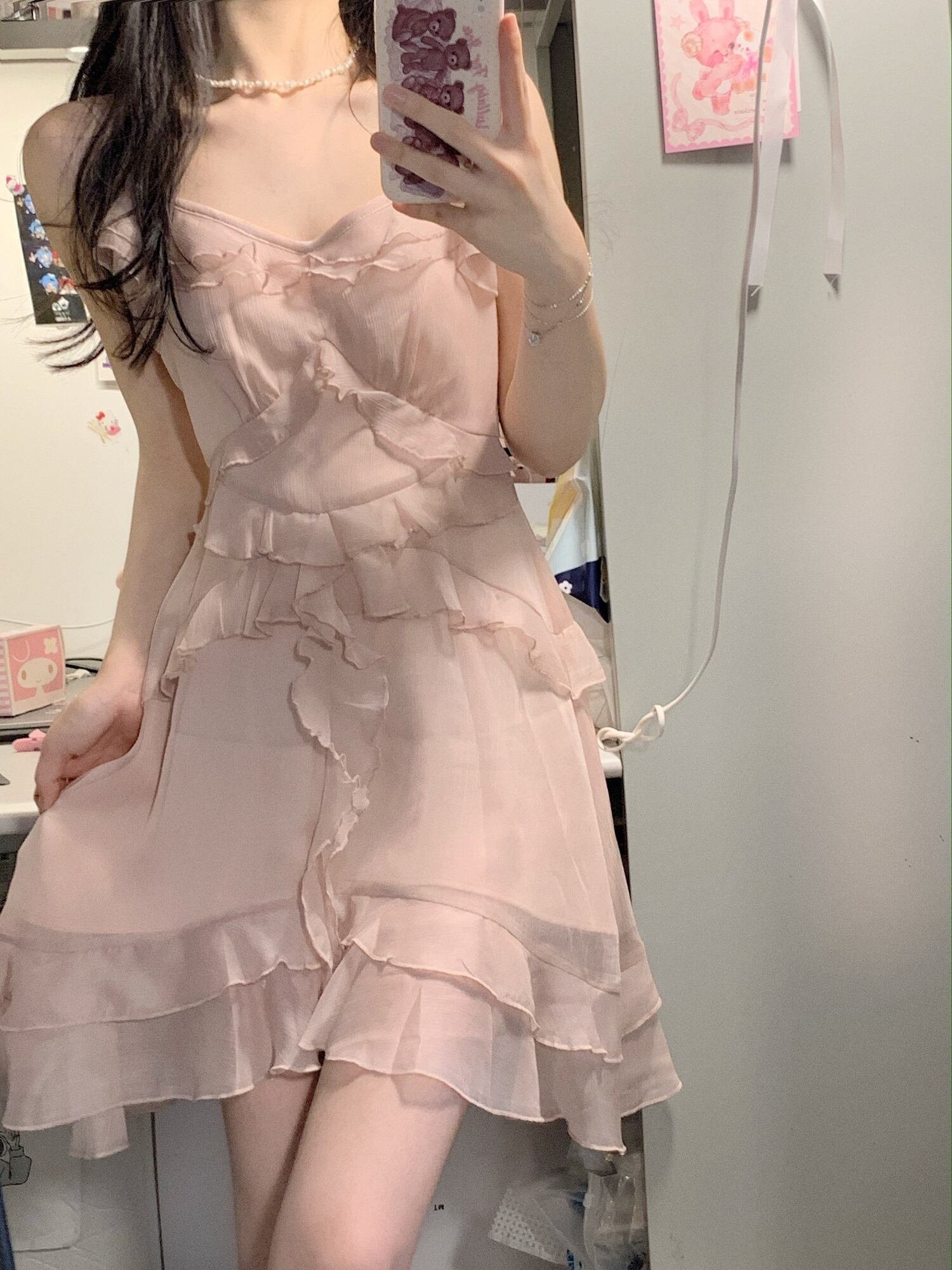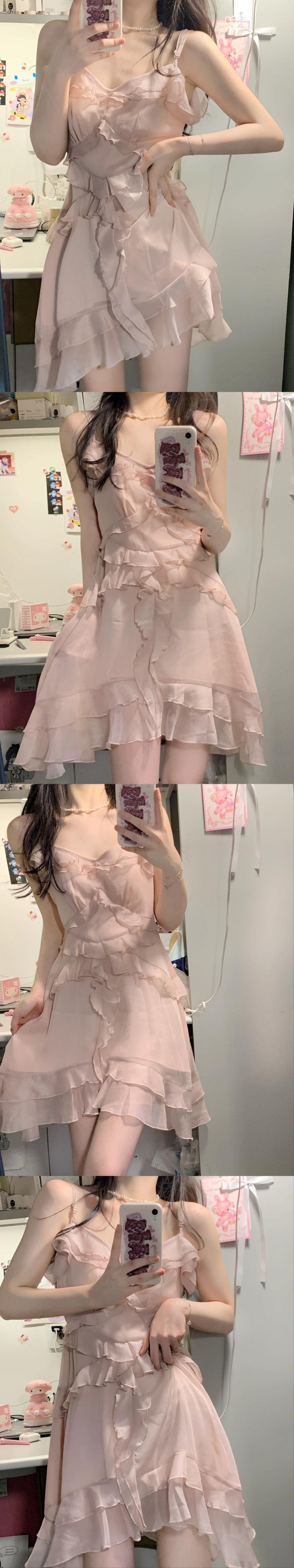 優しいフリルピンクサスペンダードレスセットサマースリムスイートスパイシー初恋ショートスカートスーツ 大人ガーリー スウィート キュート カジュアル 夏物 got51161701111