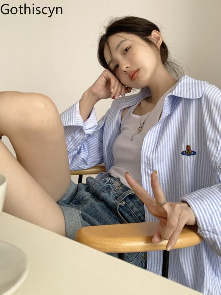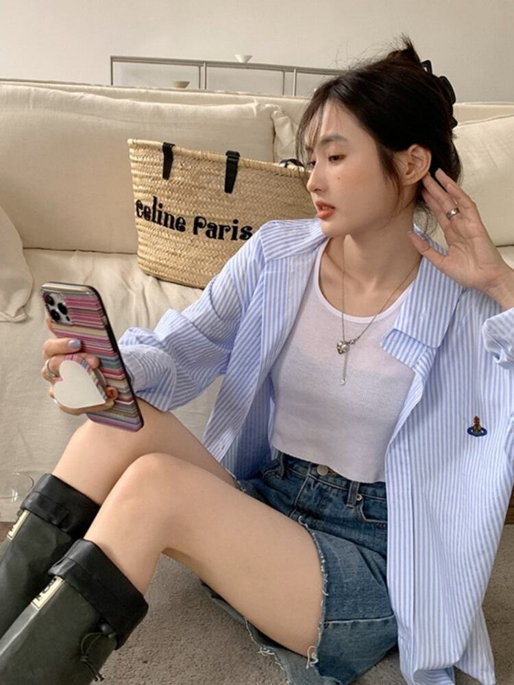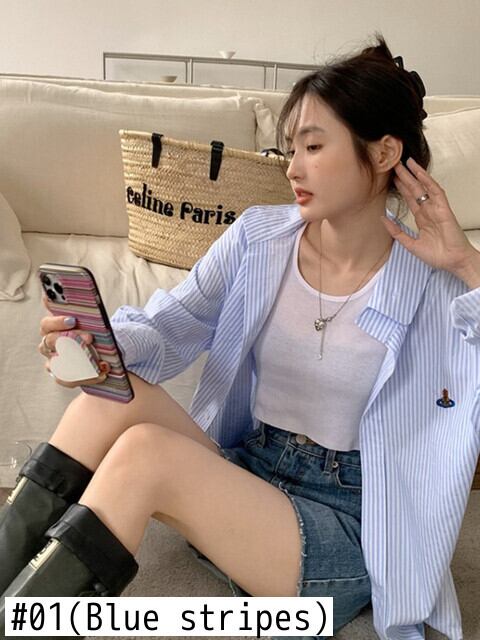 BF 風襟ストライプ シャツ ジャケット夏ルーズ ミッドレングス日焼け止めカーディガン トップ女性ブラウス特大 サマー 夏物 got22695691217