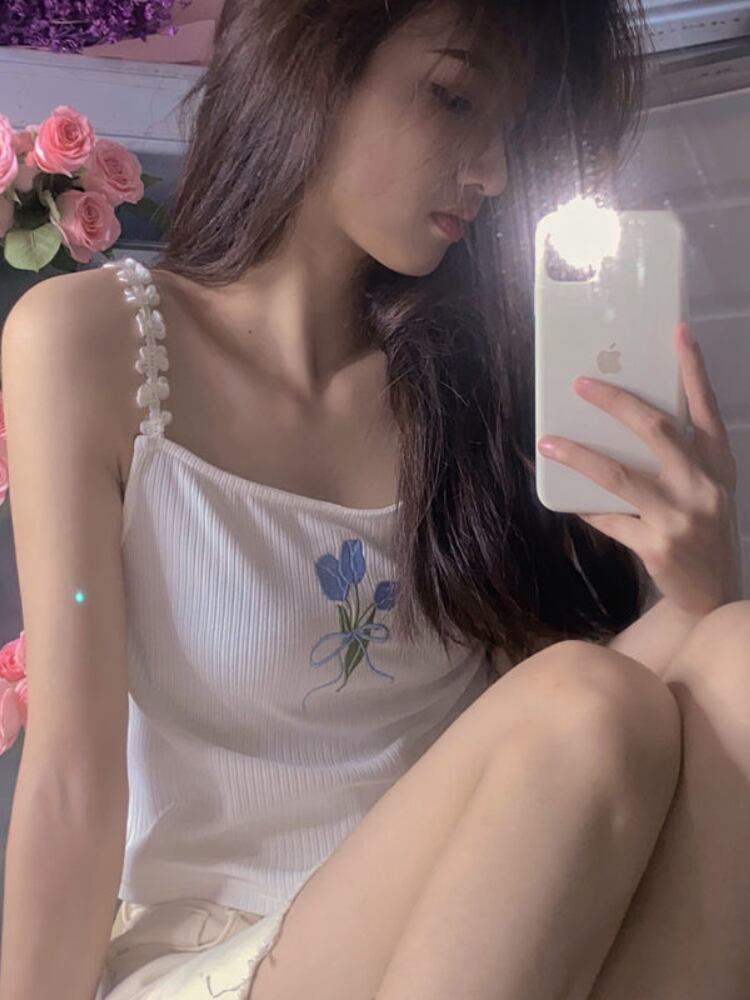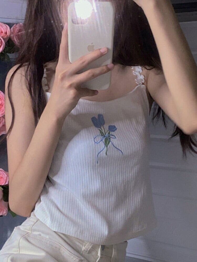 Y2k タンクキャミソールトップ夏の女性スキニークロップトップス花刺繍 V ネックノースリーブ女性ストリートコルセットキャミ サマー 夏物 花柄 Vネック got33539101406