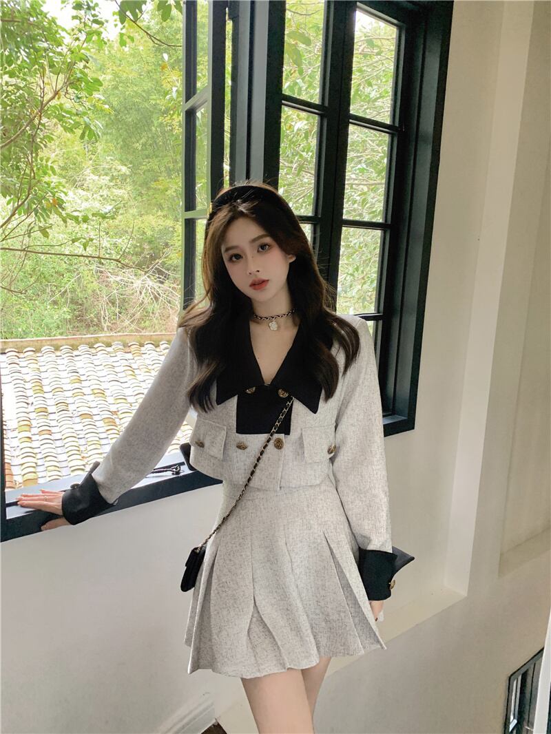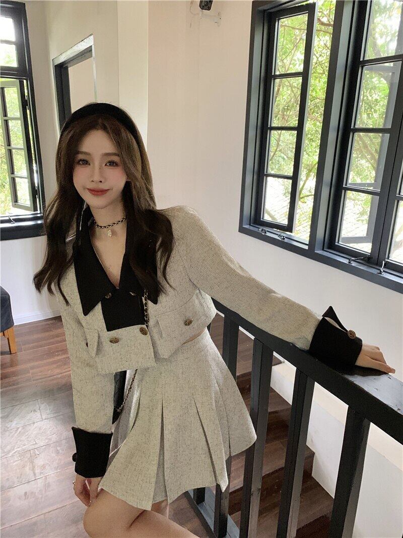 スウィートガールスーツレディース春カラーコントラストダブルブレストトッププリーツスカートツーピースセット服 大人ガーリー キュート カジュアル スプリング 春物 got78836821720