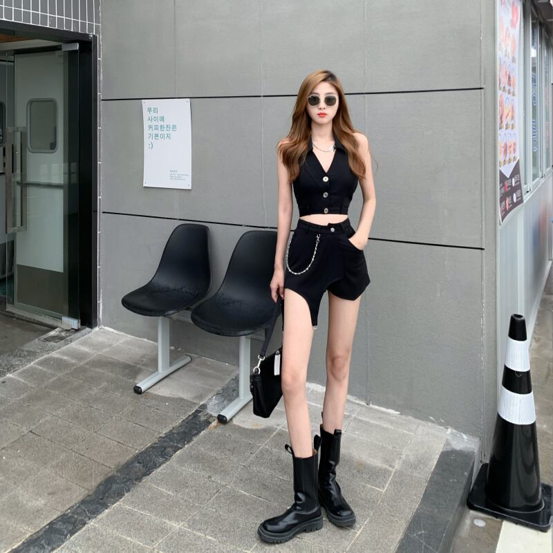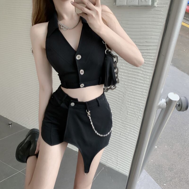 ホットガールズスーツ女性のホルターバックレスショートチョッキベスト不規則なハーフショーツスカートツーピースセット服 ブルマー got14048904859