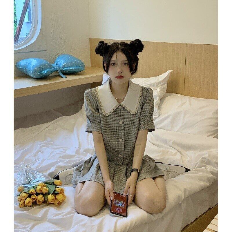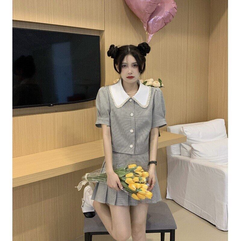 プレッピーチェック柄ミニスカートスーツセットスタイル人形の襟トップ + プリーツスカート 2 点セット女性の夏のブレザー サマー 夏物 got32739545918