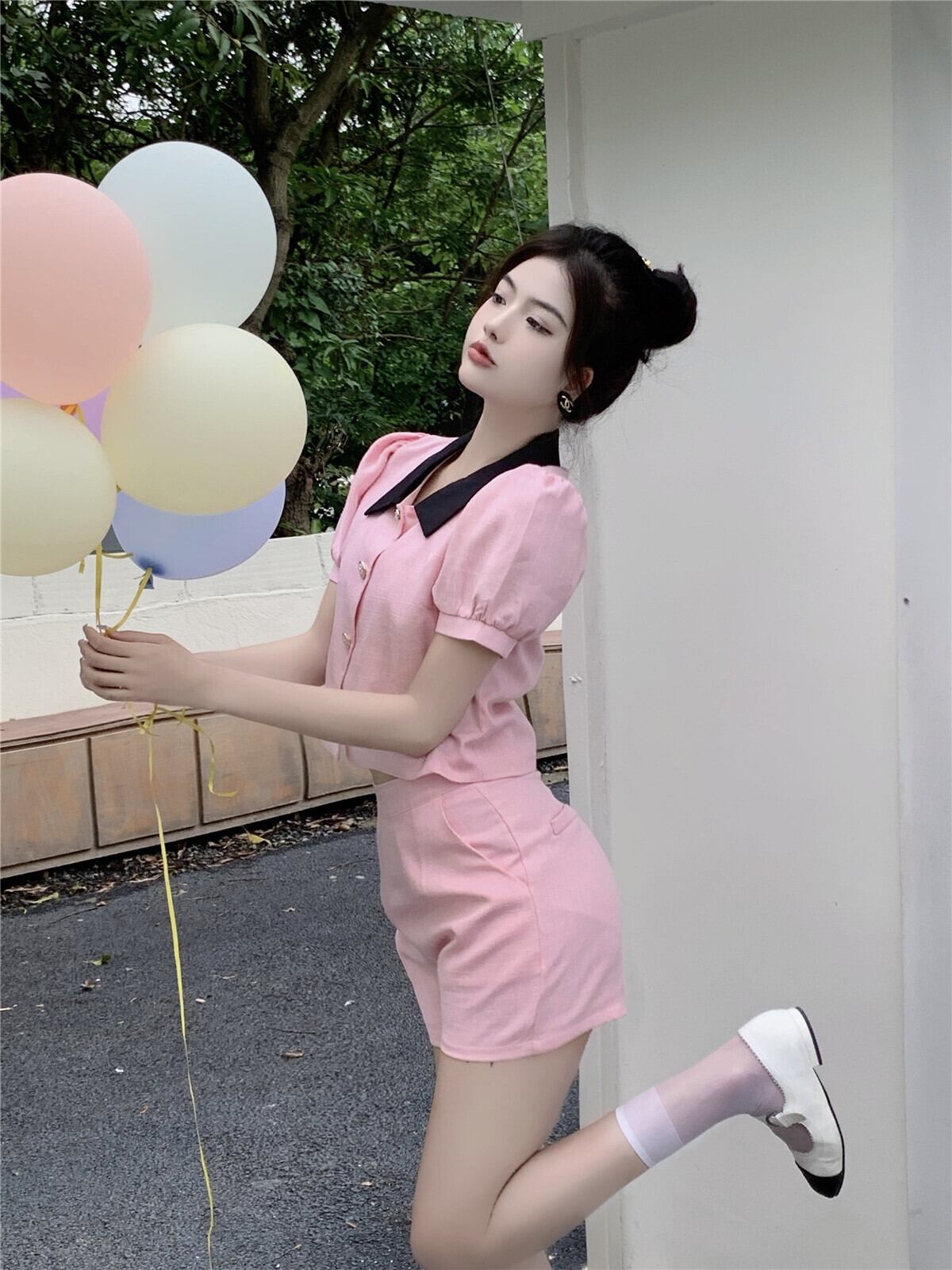 スイートガールズプロフェッショナルスーツレディースピンクターンダウンカラー半袖シャツトップスカートツーピースセット服 大人ガーリー スウィート キュート カジュアル got89590278811