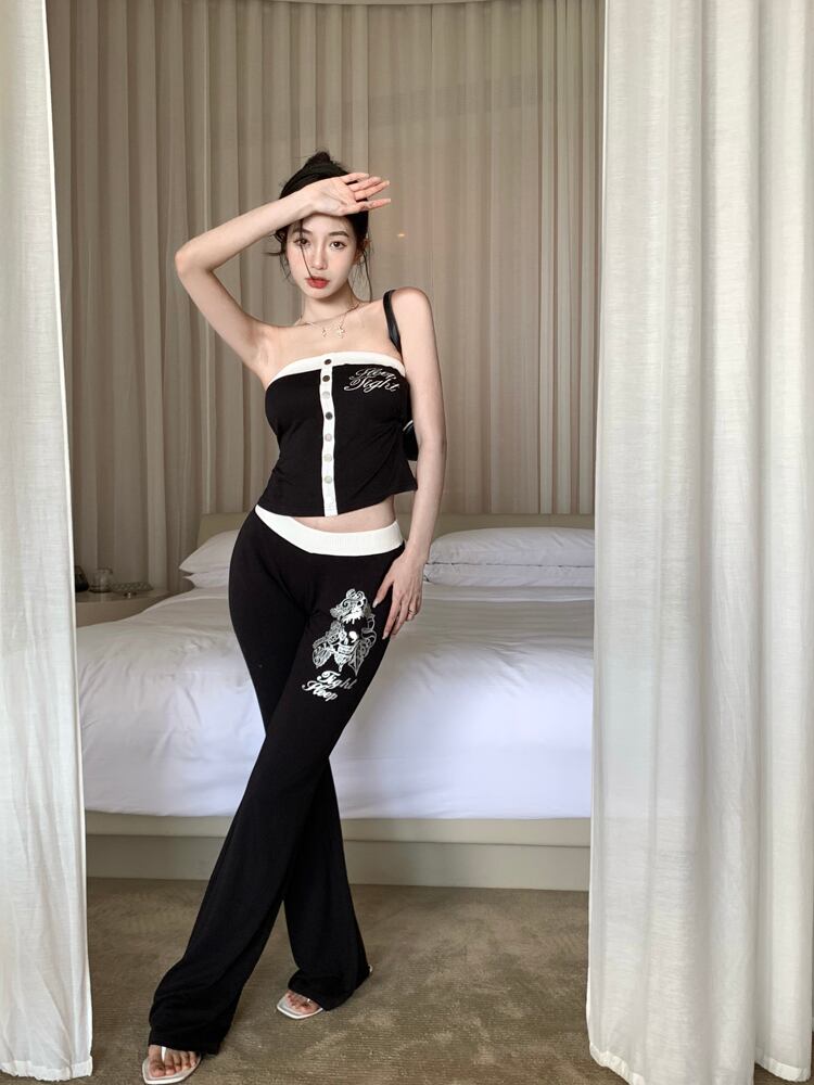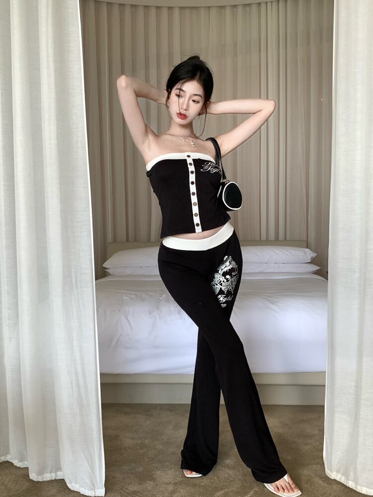 Gothiscyn スーツ女性スーツ夏ショート チューブ クロップ トップ ロー ウエスト フレア パンツ レトロ セクシー ホット ガール ツーピース セット レッド サマー 夏物 got88414169831