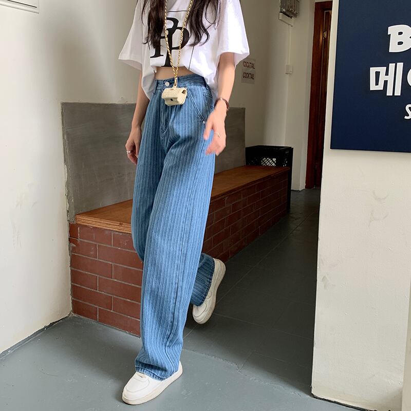 ストライプジーンズ女性春ウエストスリムストレート脚デニムパンツ掃討ズボン緩いワイド脚パパパンツ スプリング 春物 ワイドレッグ ワイドパンツ got12131355405