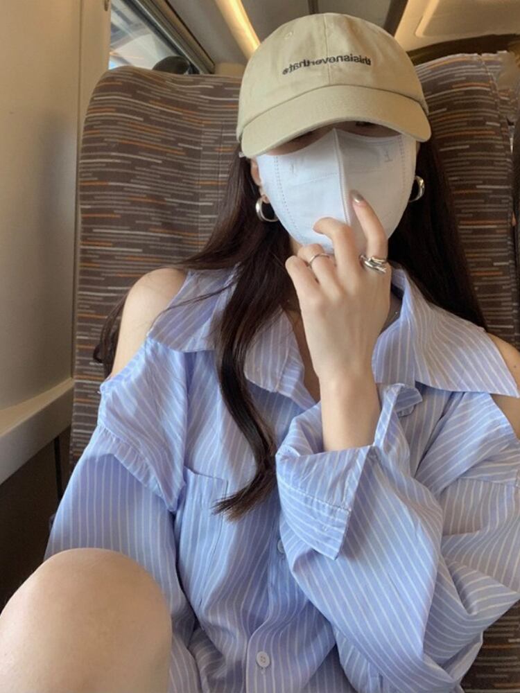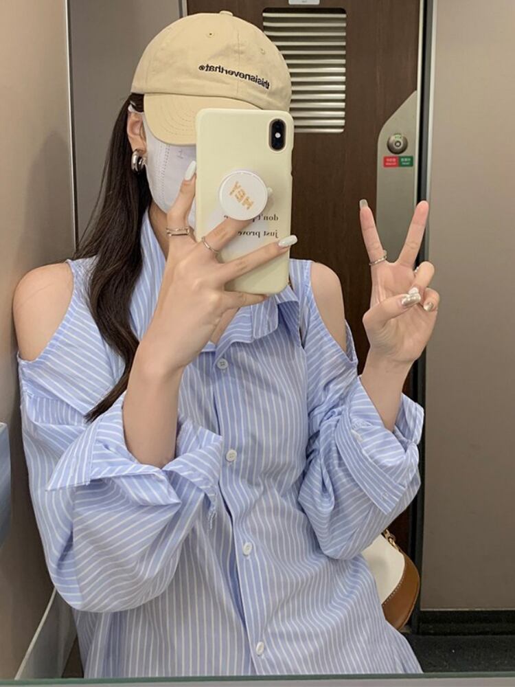 ブルーストライプブラウスシャツ女性夏慎重機オフショルダールーズシックな長袖カーディガントップ ロング サマー 夏物 got43728550467