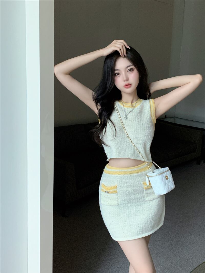 フレンチスタイル スーツ レディース 編み物感 ラウンドネック ノースリーブ ショート タンクトップ ウエストラップ ヒップスカート 2点セット Oネック got20490857207