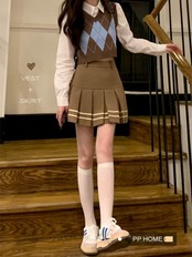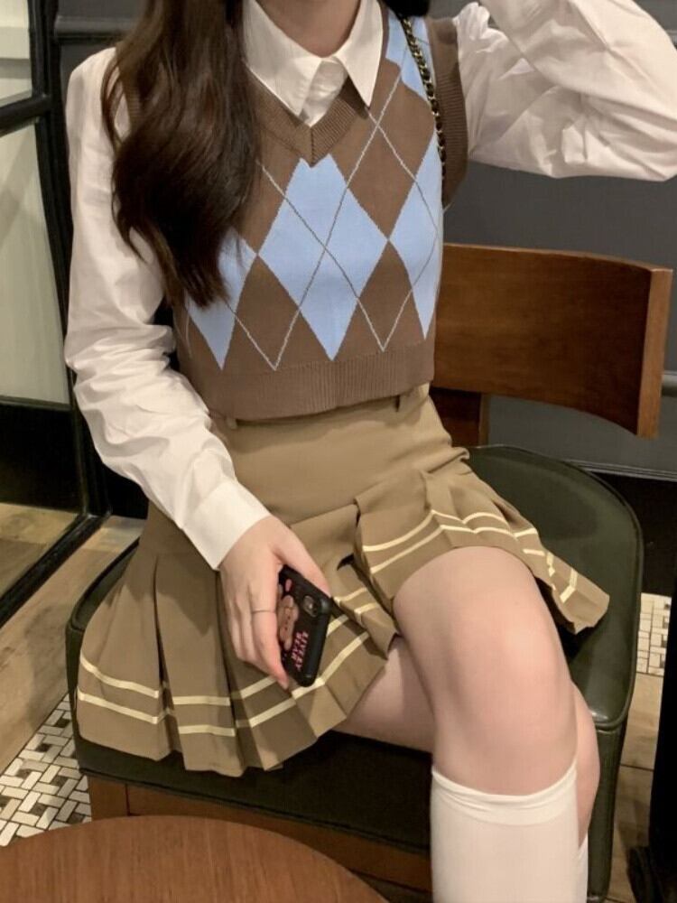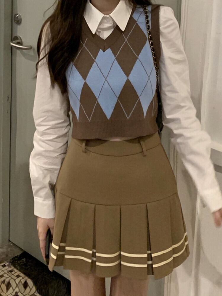 プレッピースタイルの女性スーツニットベスト + シャツ + スカートスキニー V ネック白シャツウエストコントラストカラープリーツスカートセット ホワイト Vネック got43934794349