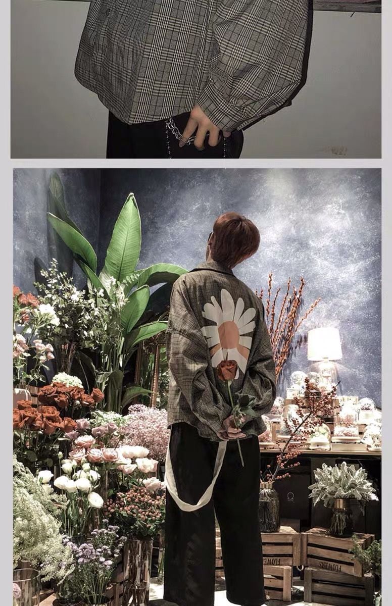 男性シャツデイジープリント特大ユニセックス服長袖チェック柄グレーバギーブラウス女性シャツ春トレンド ロング スプリング 春物 got63625905453