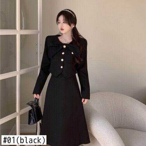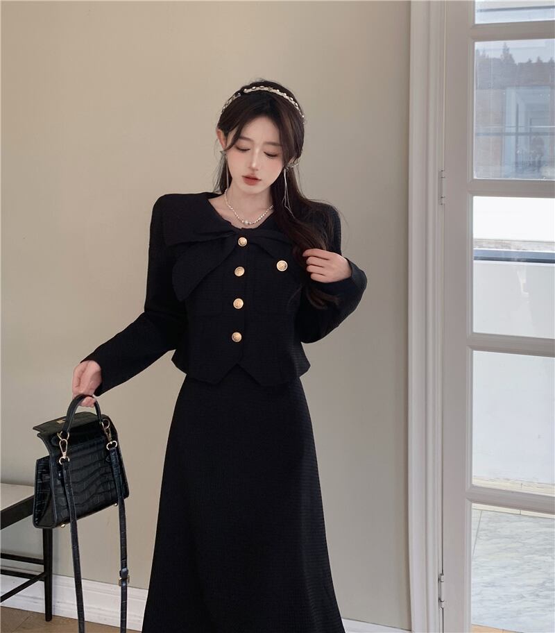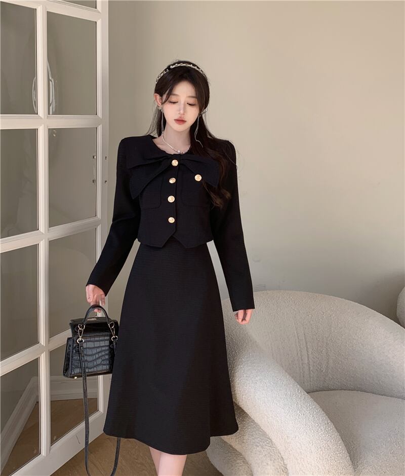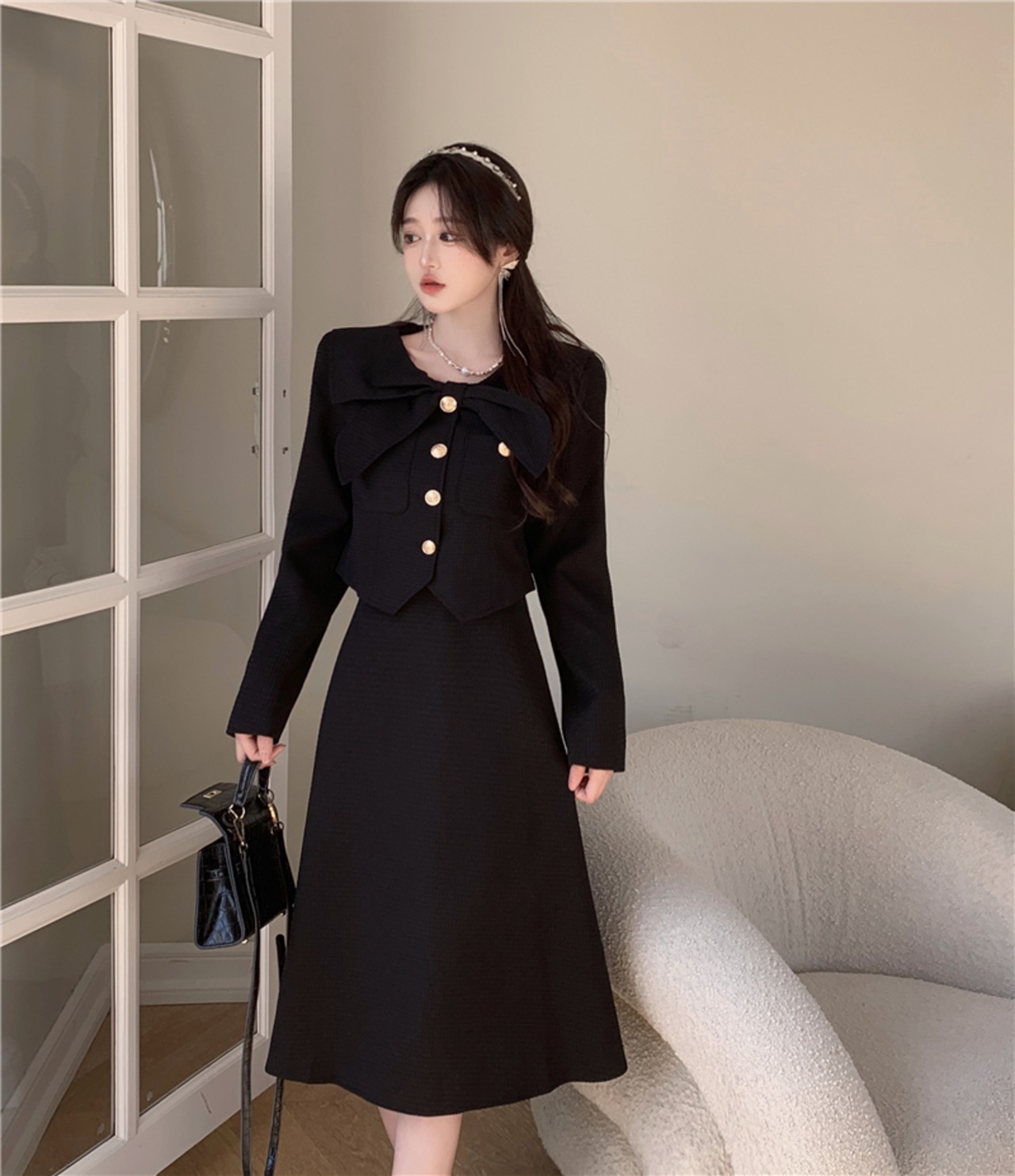 ブラックスーツ 個性的 レトロ 長袖 ちょう結び コート Aライン スカート 2点セット OL服 ロング リボン 会社 学校 通勤や通学にも got1930580820