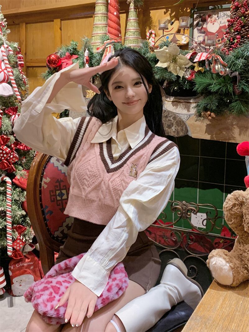 秋冬スタイルスーツレディースピンクVネックニットタンクトップ白シャツショートスカート3点セット ホワイト オータム 秋物 ウィンター 冬物 got86843317699