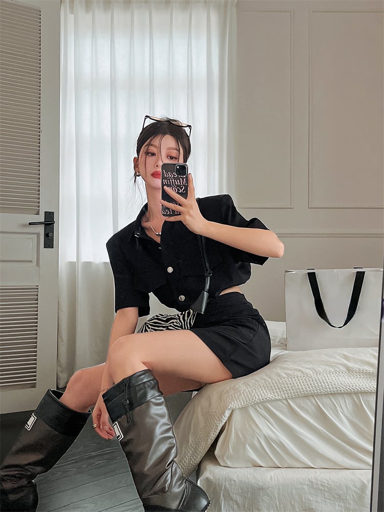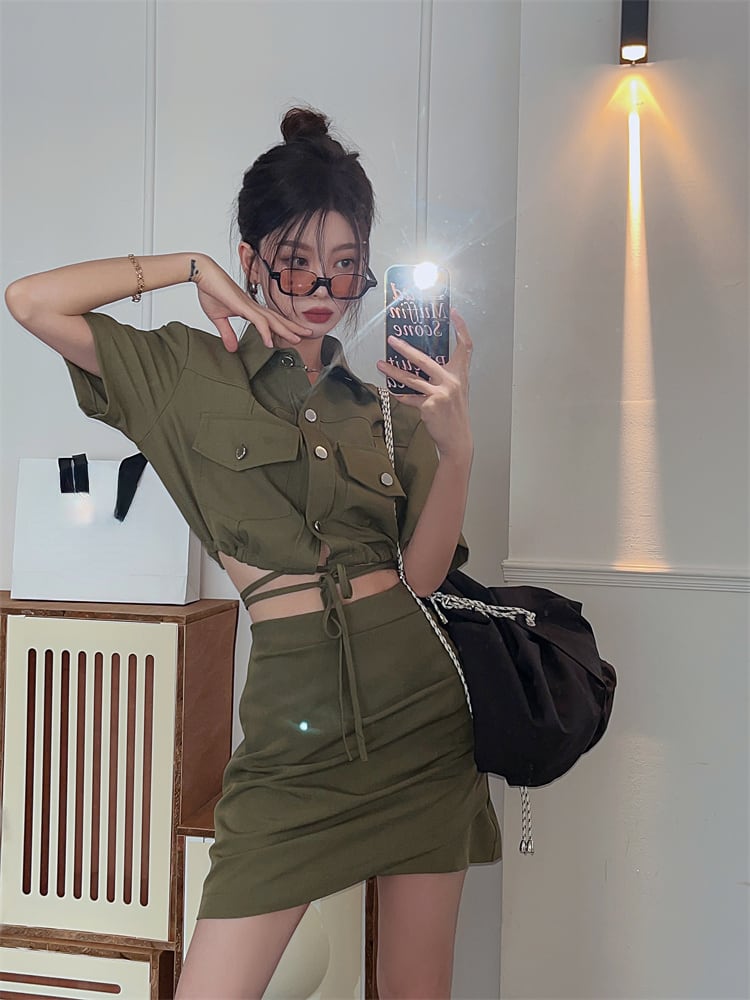 ミニスカートセット女性の半袖トップ A ライン弾性ウエストスカート 2 ピーススカートセット女性ターンダウン襟セット ショート ハーフスリーブ エラスティック 伸縮 Aライン got770157982