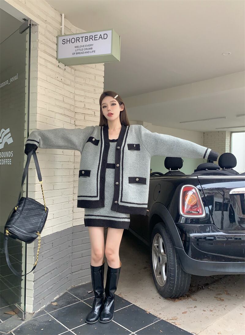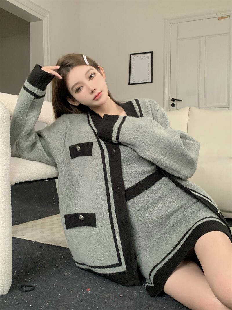 オフィスレディレトロスーツVネックニットカーディガンコート秋冬スリムスリングドレスツーピースセット服 オータム 秋物 ウィンター 冬物 会社 学校 通勤や通学にも got5203674778