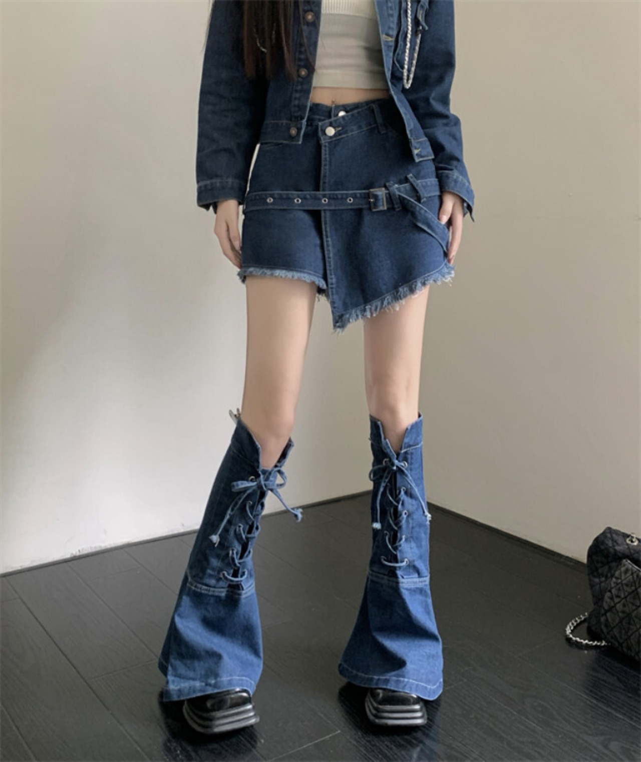 ホットガールスーツレディースレトロホットガールデニムジャケットスリムイレギュラーショートスカートフレアレースアップレッグカバー3点セット got85639869514