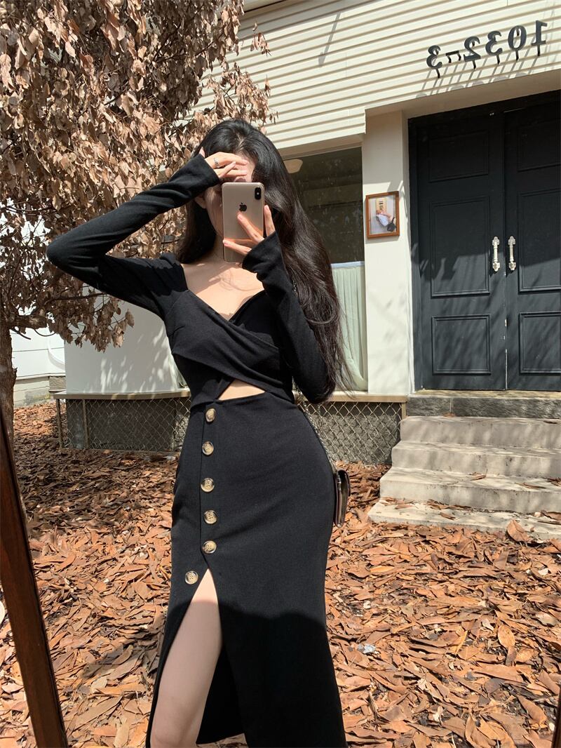 秋のセクシーな女性の黒のホットガールスタイルディープ V ネックスリム中空アウトウエストミッドレングスのドレスの服 ブラック オータム 秋物 Vネック got25647829264