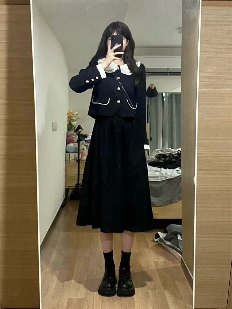 Gothiscyn ツーピースセット女性ピーターパンカラーショートコート黒ミッドカーフスカートプレッピースカートセット衣装 ブラック got25697775229