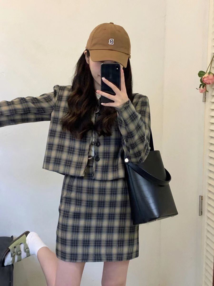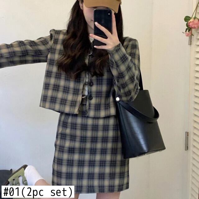 オフィスレディ秋スーツ女性のチェック柄長袖カーディガンコートスリムラップヒップスカート 2 点セット服 ロング オータム 秋物 会社 学校 通勤や通学にも got89799815226