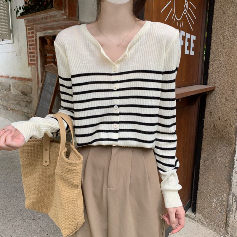 ニット カーディガン ストライプ V ネック 長袖 トップ ルーズ カーディガン レディース 春/秋 オーバーサイズ セーター セーター ロング スプリング 春物 オータム 秋物 Vネック got83607396278