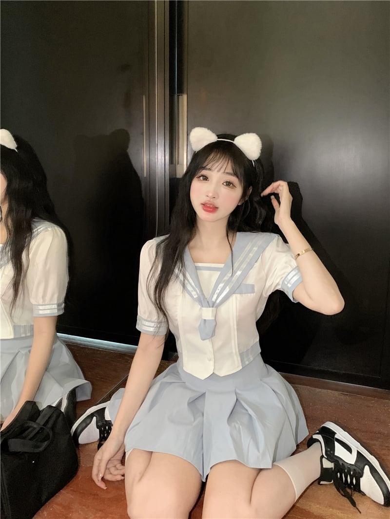 スタイルスーツ女性の甘いセーラー襟半袖シャツウエストスリム A ラインスカート 2 点セット服 大人ガーリー スウィート キュート カジュアル Aライン got14277342226