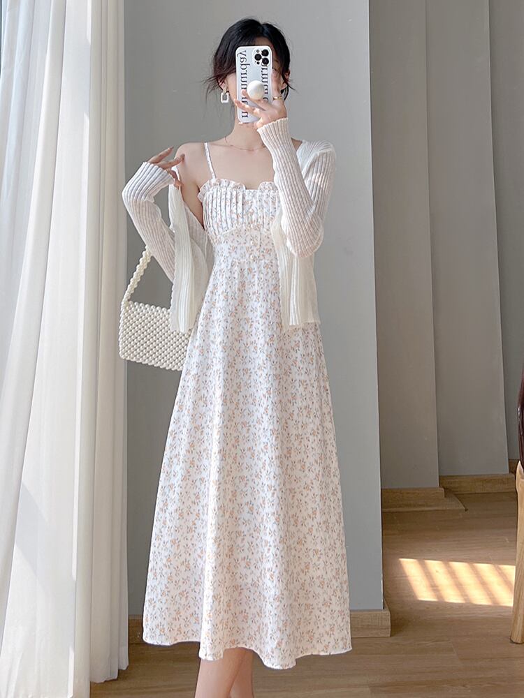 Gothiscyn レディース スーツ ソリッド ロングスリーブ ニット カーディガン 花柄 ミディドレス 2点セット 春スタイル 長袖 スプリング 春物 ソリッドカラー got12946424629