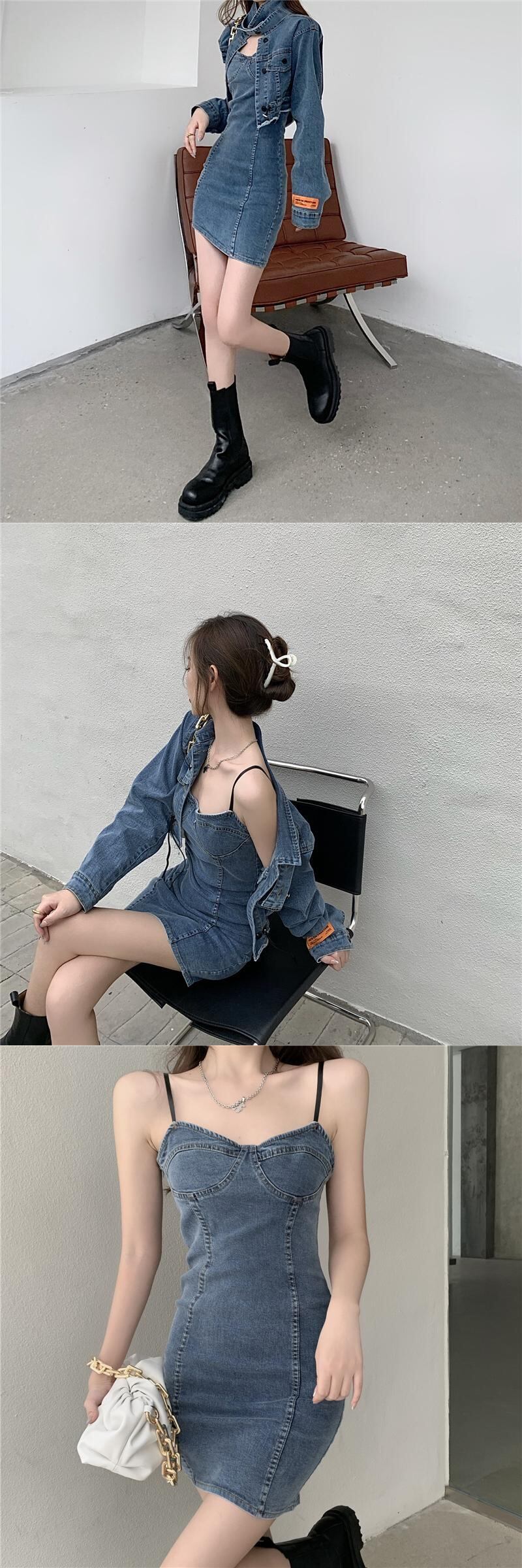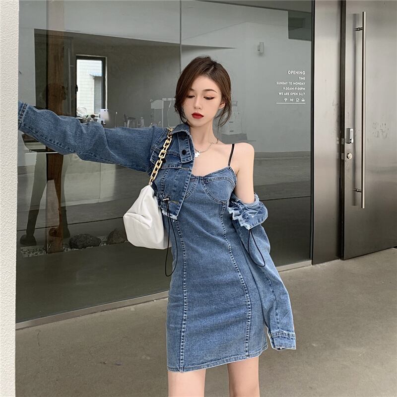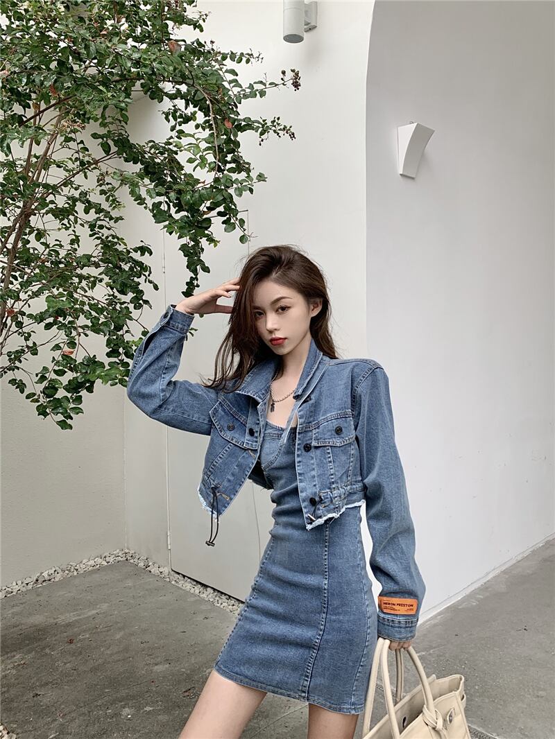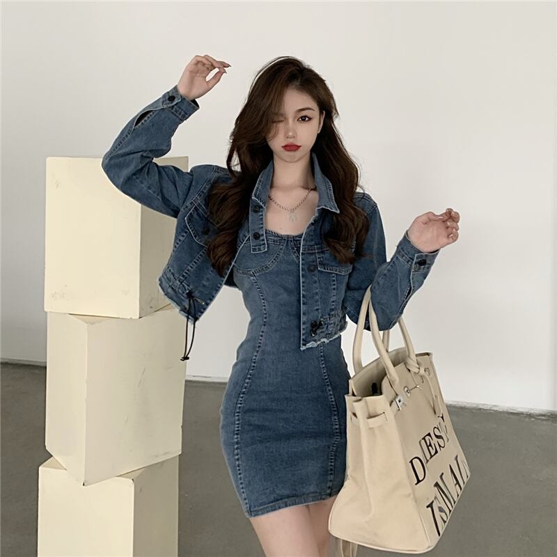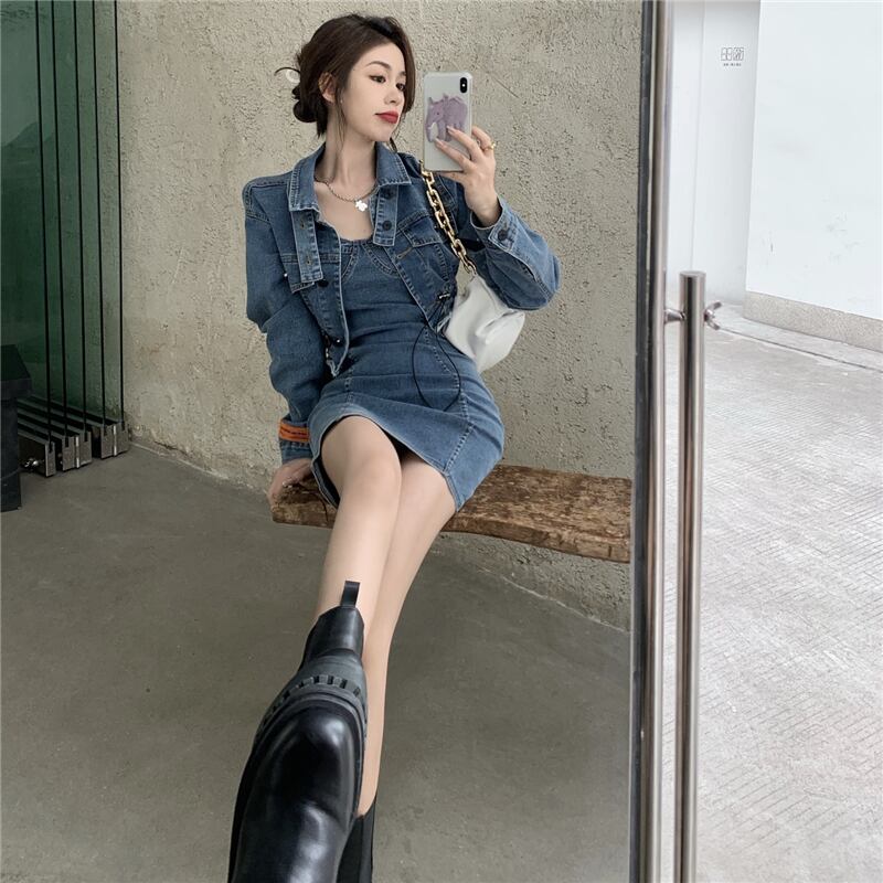 春先デニムスーツレディーススタイル長袖ショートジャケットスリムサスペンダードレスツーピースセット服 ロング スプリング 春物 got53487795412