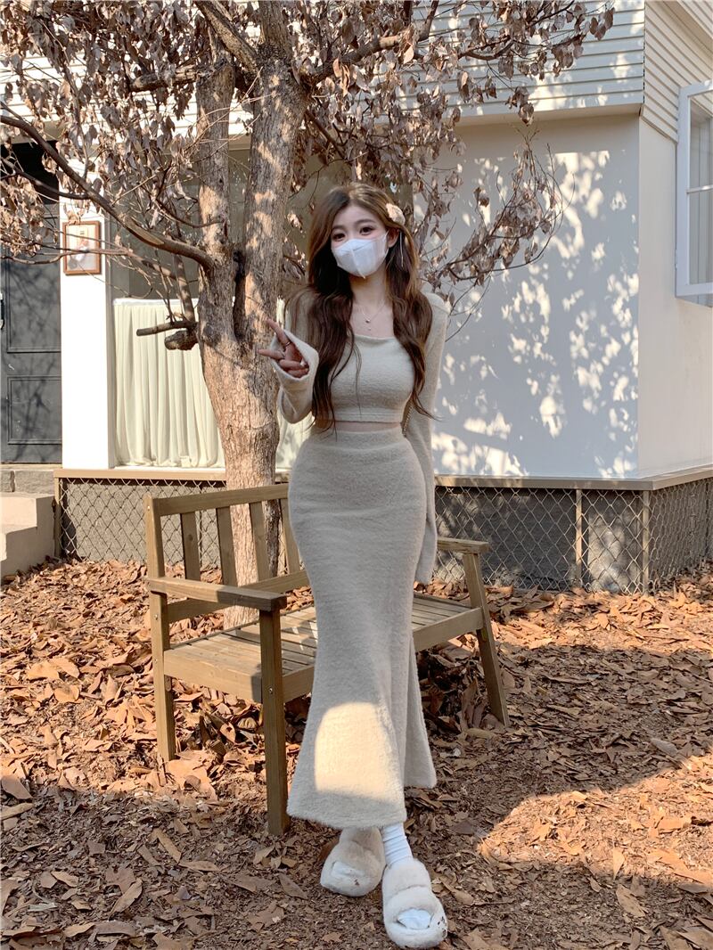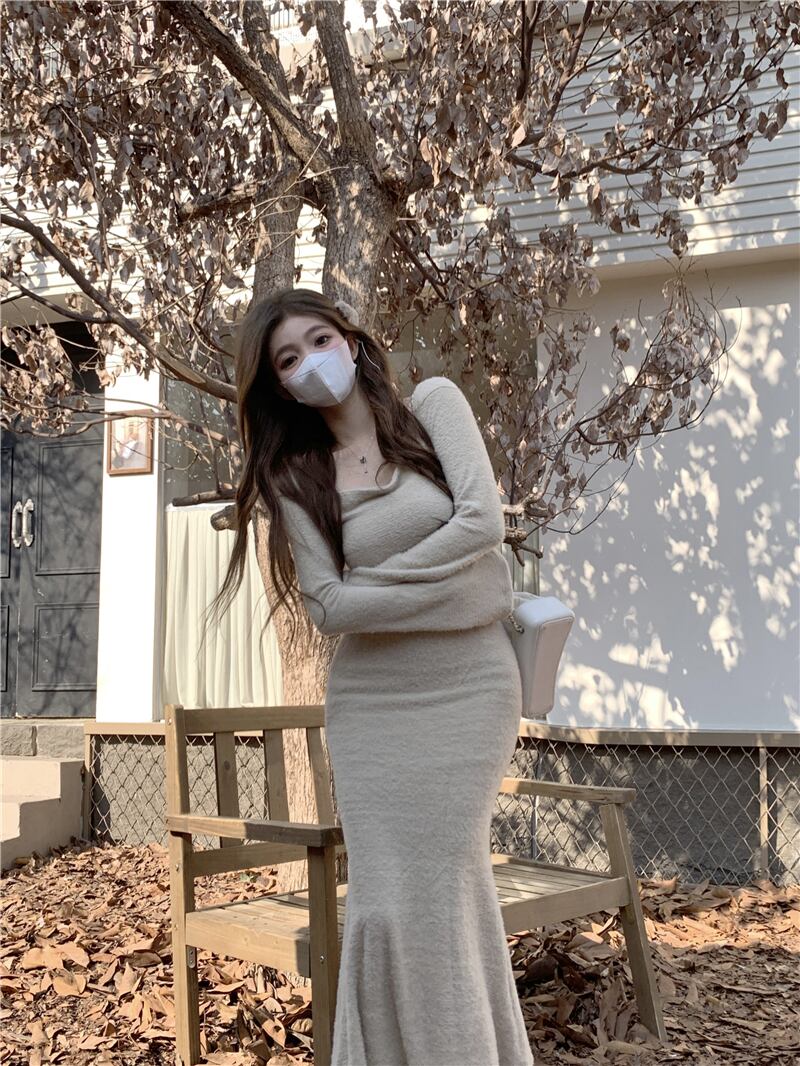 ホットガールスーツ女性の冬のスクエアカラー長袖ショートニットマーメイドスカートツーピースセット服 ロング ウィンター 冬物 スクウェア got53100604926