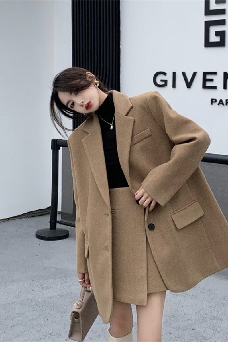 ウールスーツ レディース ゆったりスタイル スーツ コート ウエスト Aライン イレギュラースカート 2点セット 洋服 got50292747984