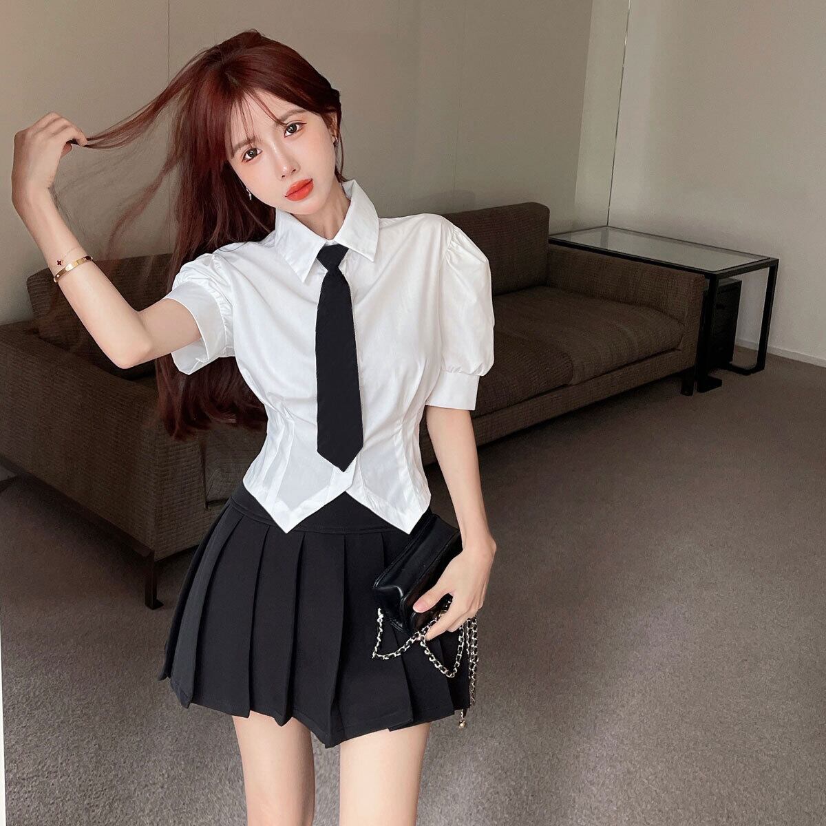 夏ツーピース スカート セット Laides プレッピー スタイル小さなツーピース スーツ パフ スリーブ シャツ ウエスト プリーツ スカート サマー 夏物 got48978681760