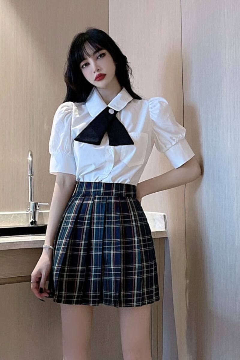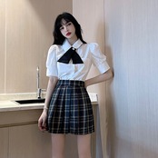 ブラウス ミニスカート セット シャツ 夏 半袖 プレッピー スタイル ニッチ パフスリーブ ボウ ホワイト トップス ショート リボン ハーフスリーブ サマー 夏物 got86382443569