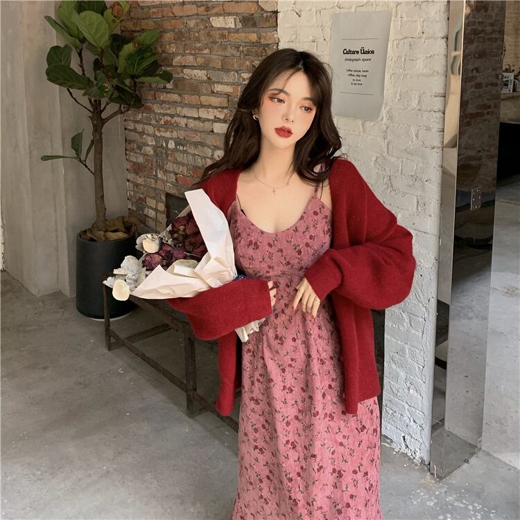 スウィート ガール スーツ女性の秋と冬の赤いセーター ニット カーディガン コート ピンク サスペンダー花ドレス服 レッド 大人ガーリー キュート カジュアル オータム 秋物 ウィンター 冬物 花柄 got83501906516