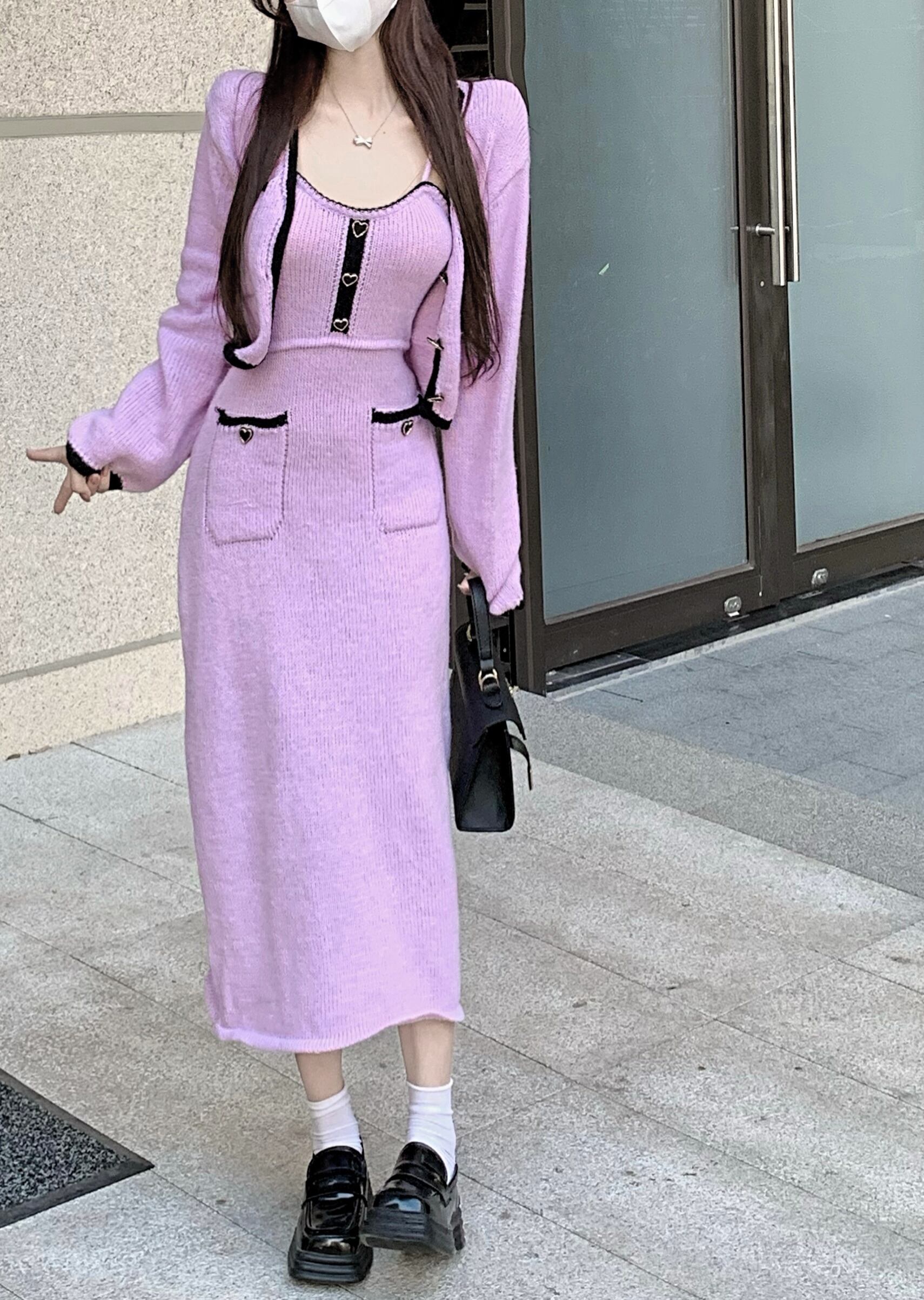 パープル ニットスーツ 長袖 ニット ショートカーディガン スパゲッティ ストラップ スリムワンピース ツーピース セット 洋服 ロング got40644602982