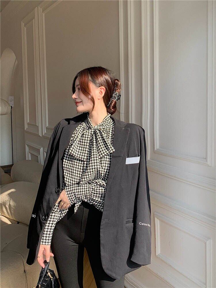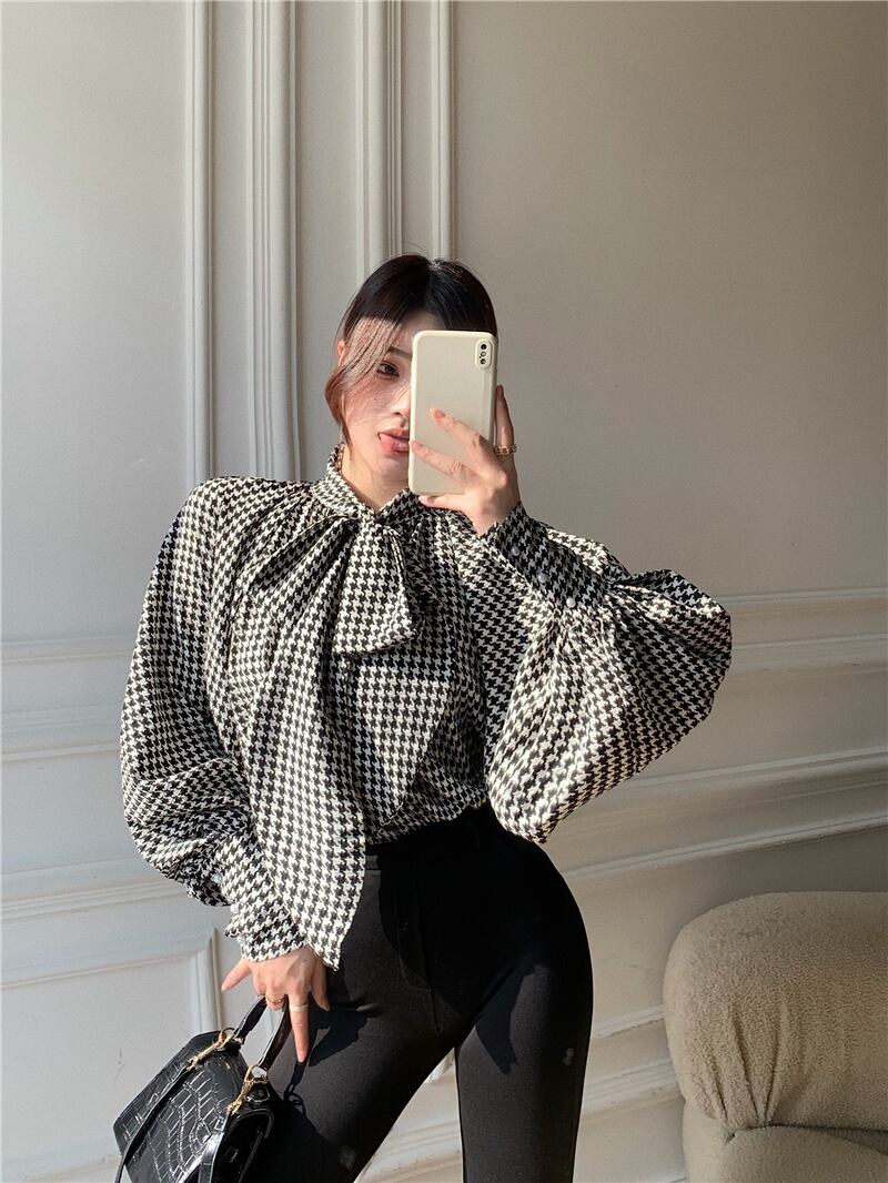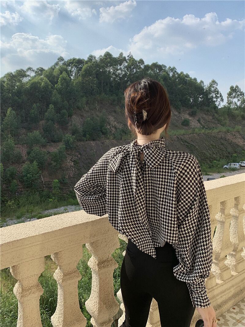 レディーストップスとブラウススタイルチェック柄長袖女性ブラウス蝶ネクタイルーズフィットシャツ秋シャツトップ ロング リボン オータム 秋物 got6557973414