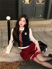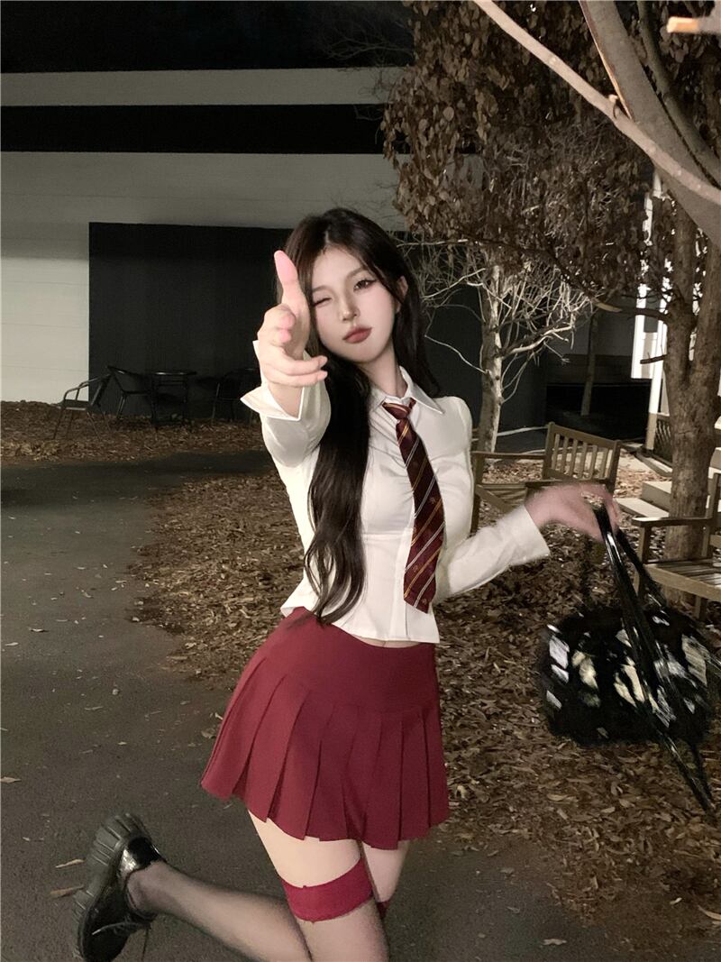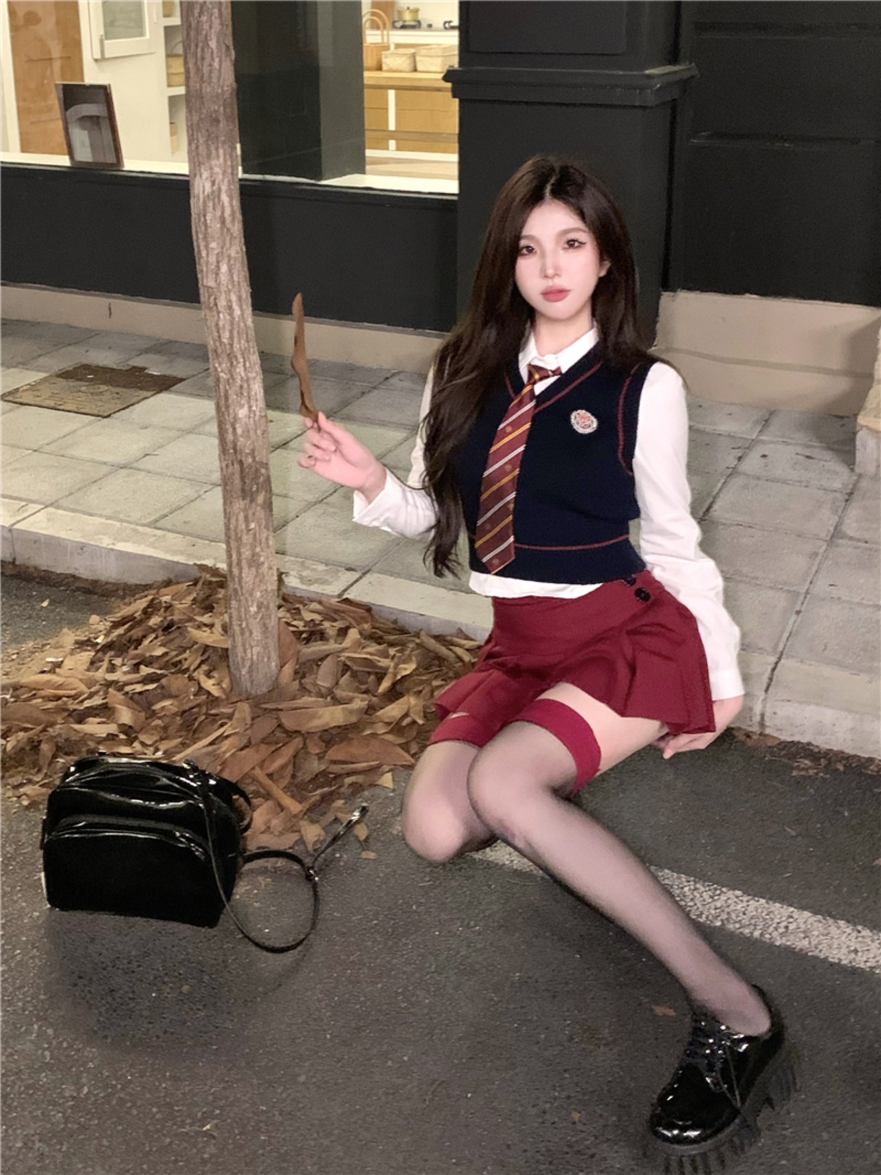 スタイルガールスーツ長袖白シャツニットベスト赤ウエストプリーツスカート 3 点セット服 ロング ホワイト レッド got75708820504