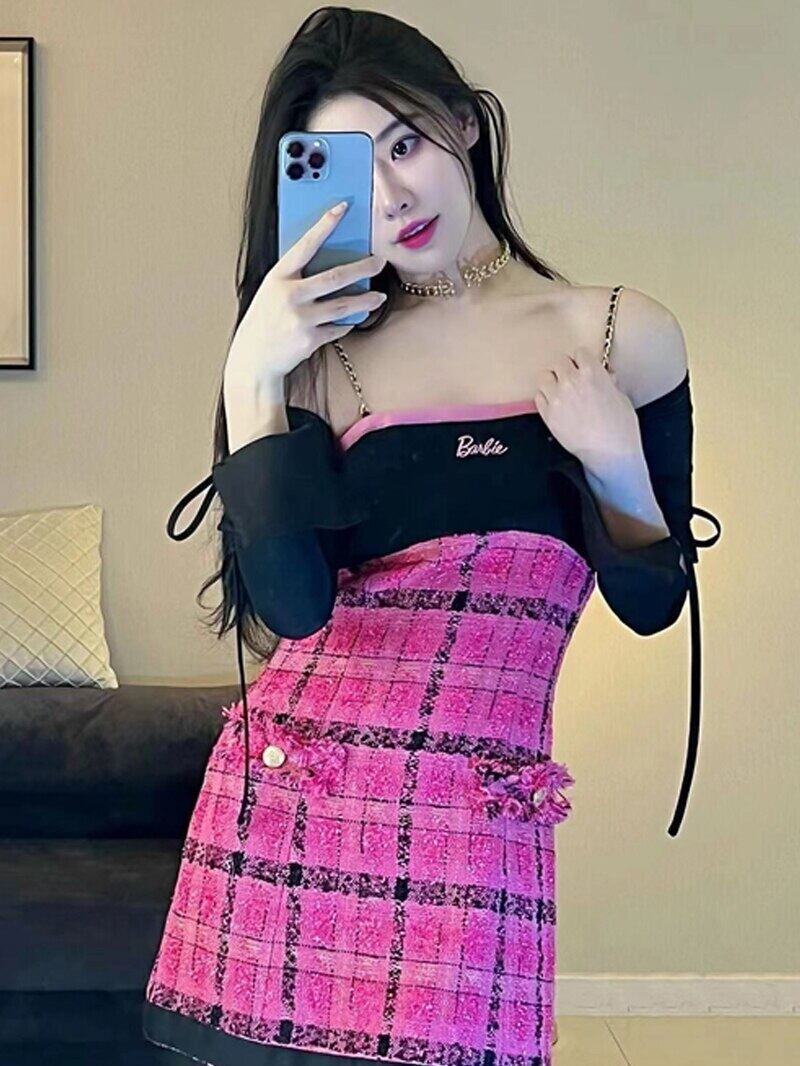 ピンクチェック柄ホットガールスーツスタイル長袖ショールスパゲッティストラップ A ラインドレス 2 点セットセクシーな服 ロング Aライン got53393523945