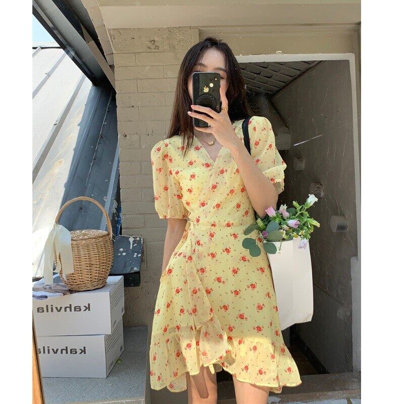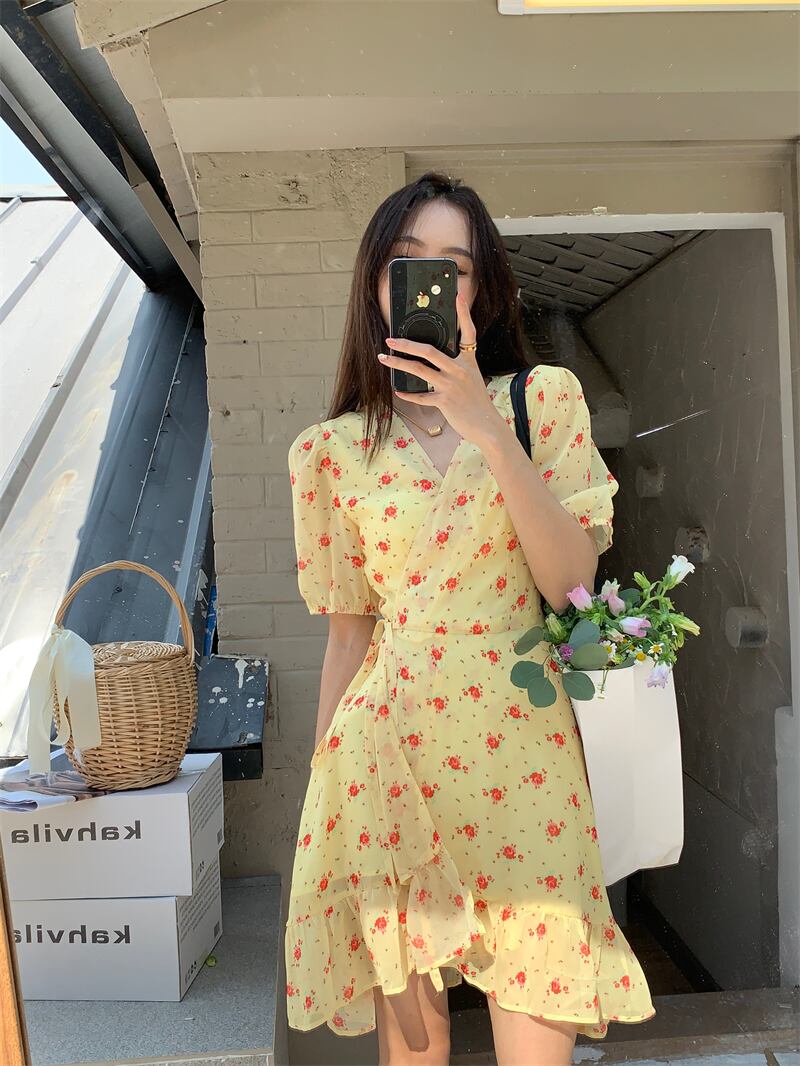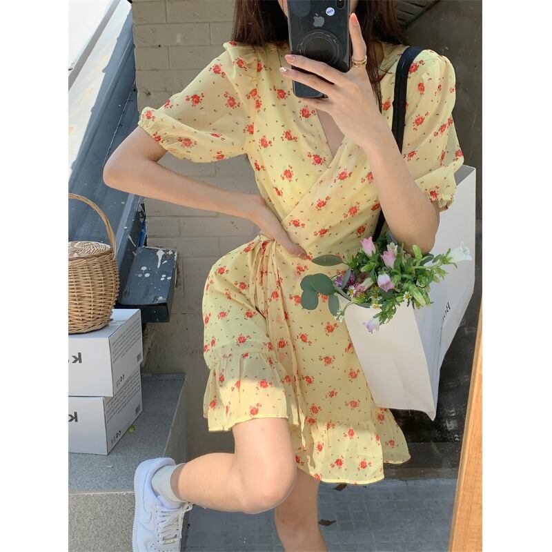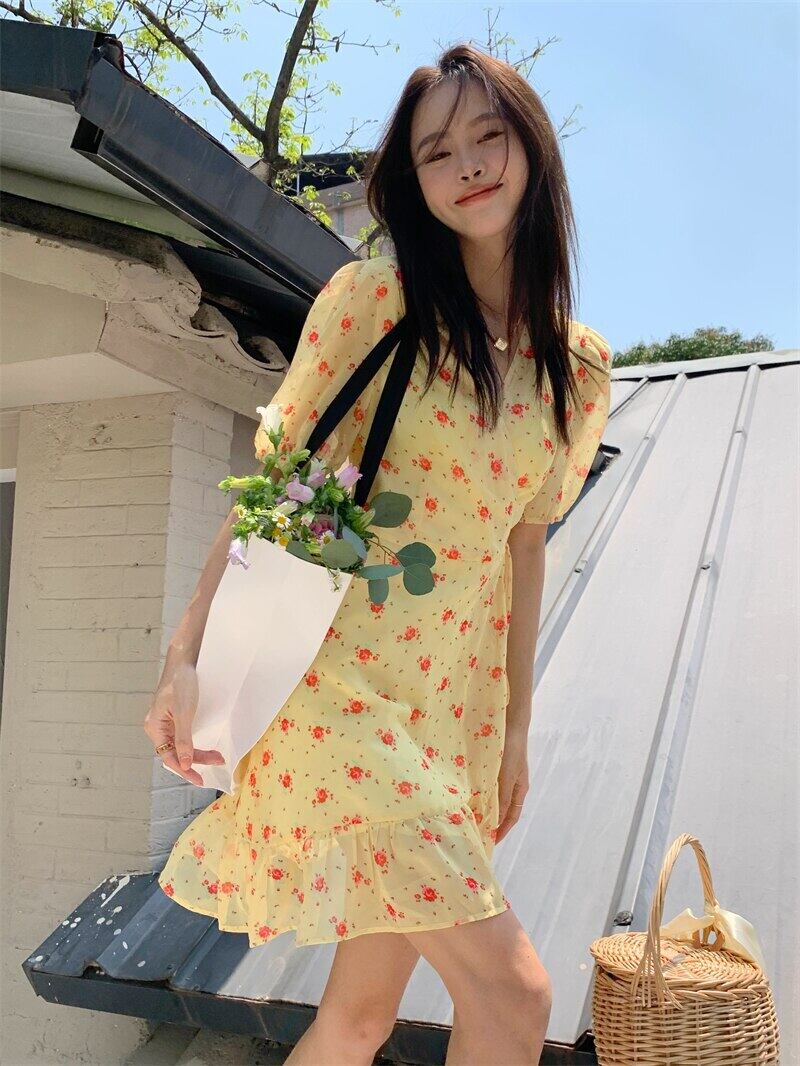 フリル黄色の花ドレス女性フレンチ気質シフォンスカート夏パフスリーブスモールショートサマードレス女性 Vestidos 夏物 花柄 got38881496844
