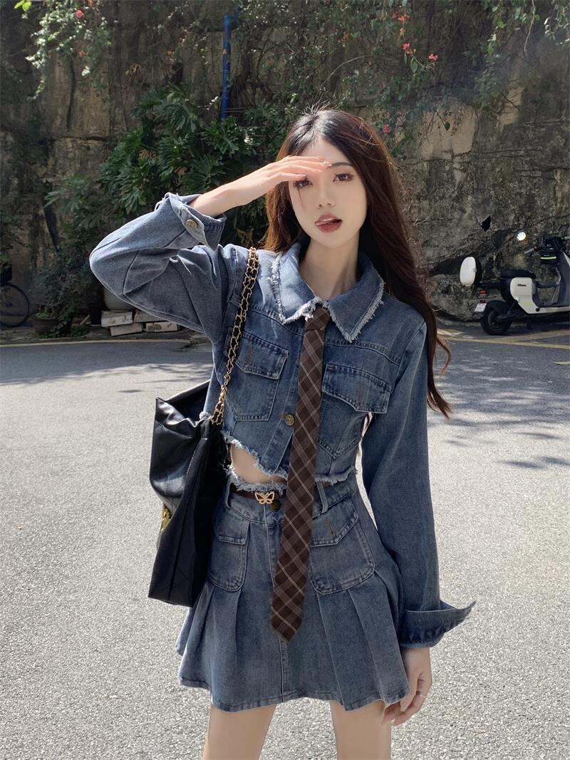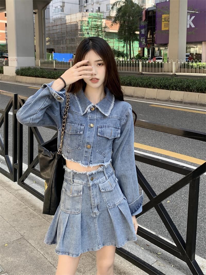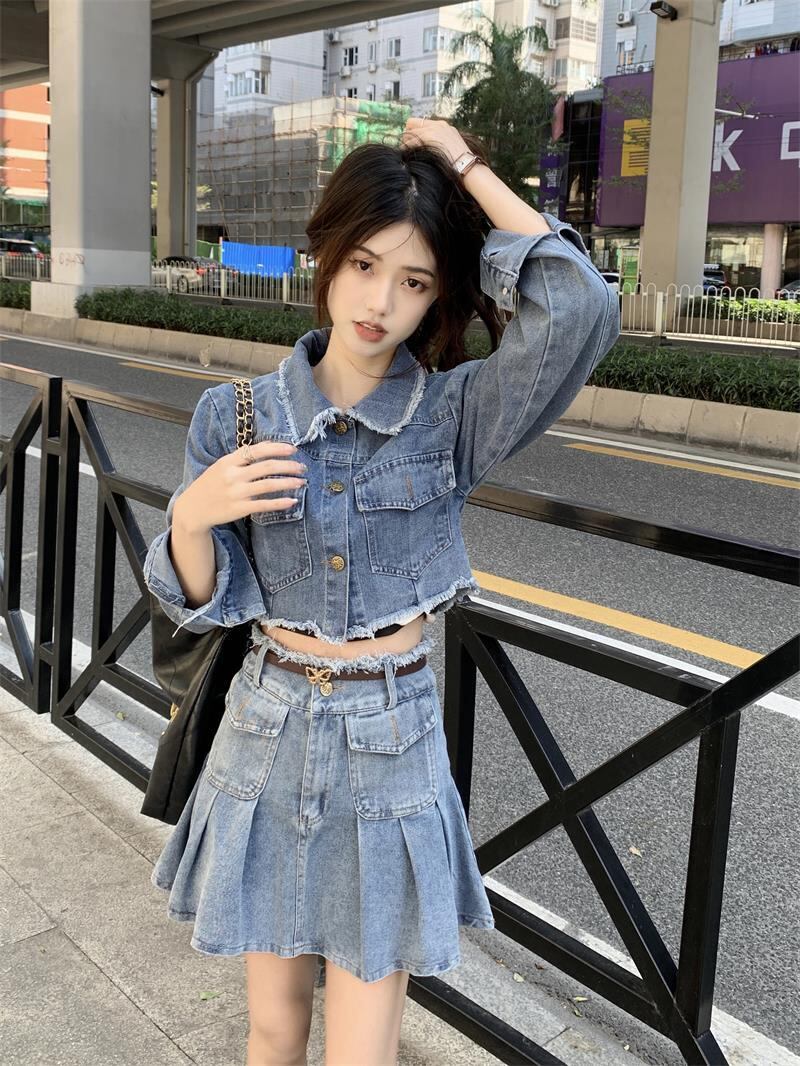 Sweet-cool ホットガールズデニムスーツ女性の春起毛ショートコートウエストプリーツスカート 2 点セット服 大人ガーリー スウィート キュート カジュアル スプリング 春物 got71080214466