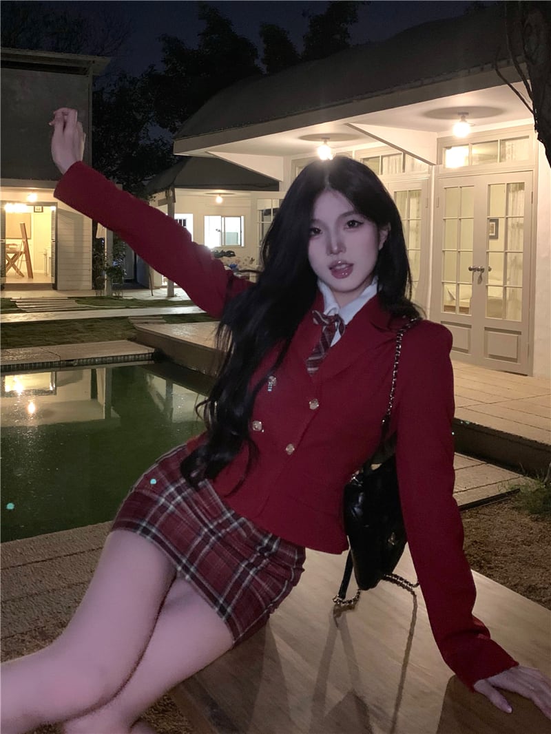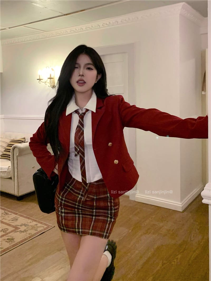 スタイルスーツ レディース 赤コート ウエスト スリム チェック柄 お尻スカート 万能 白シャツ JK 3点セット ホワイト レッド got6292959803