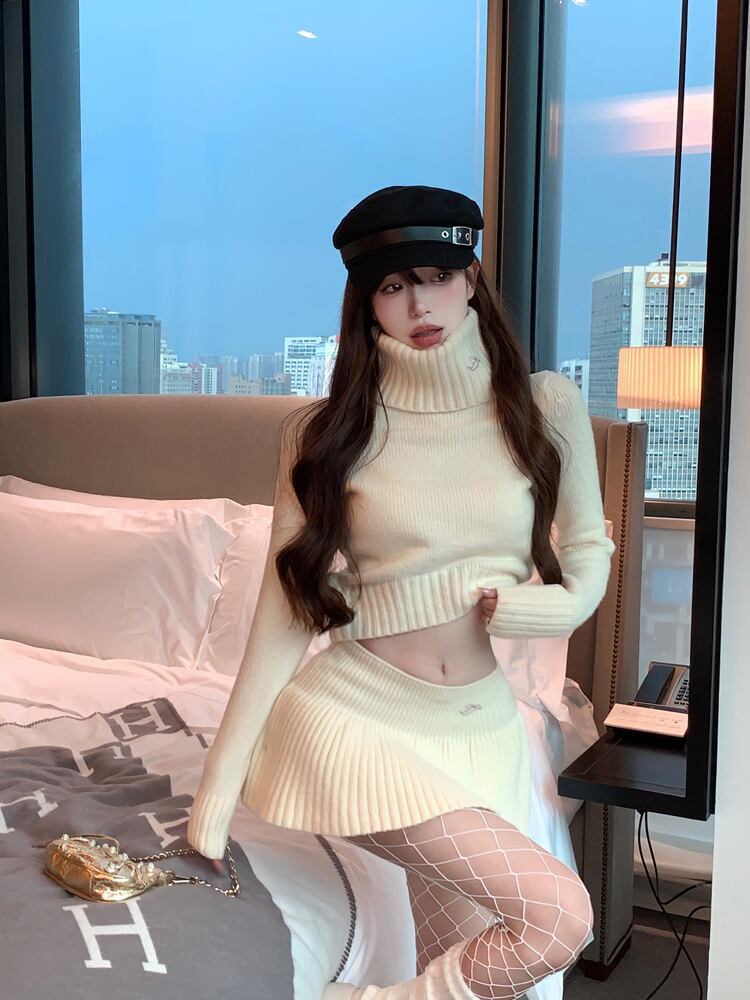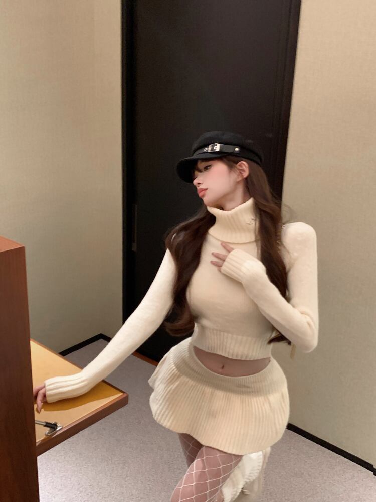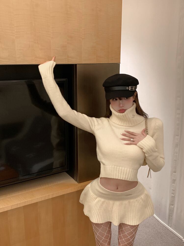 スウィートガールニットスーツ女性レトロタートルネックロング-sleevecショートプルオーバーセーターローウエストプリーツミニスカートツーピースセット 大人ガーリー キュート カジュアル got51468485009