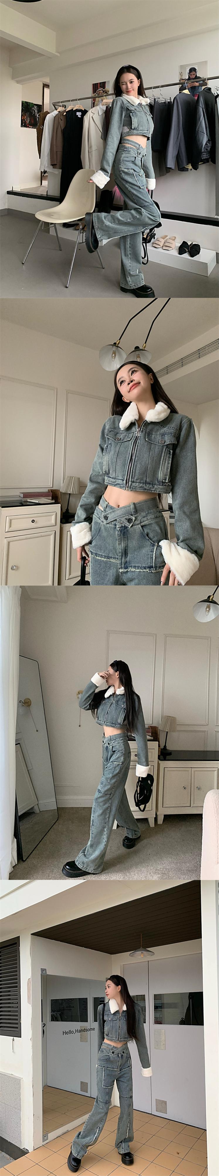 Cl スーツ レディース 冬 香港スタイル プラッシュ ロングスリーブ ジャケット スプライシング ワイドレッグ ジーンズ 2点セット ウィンター 冬物 ワイドパンツ got74979360138