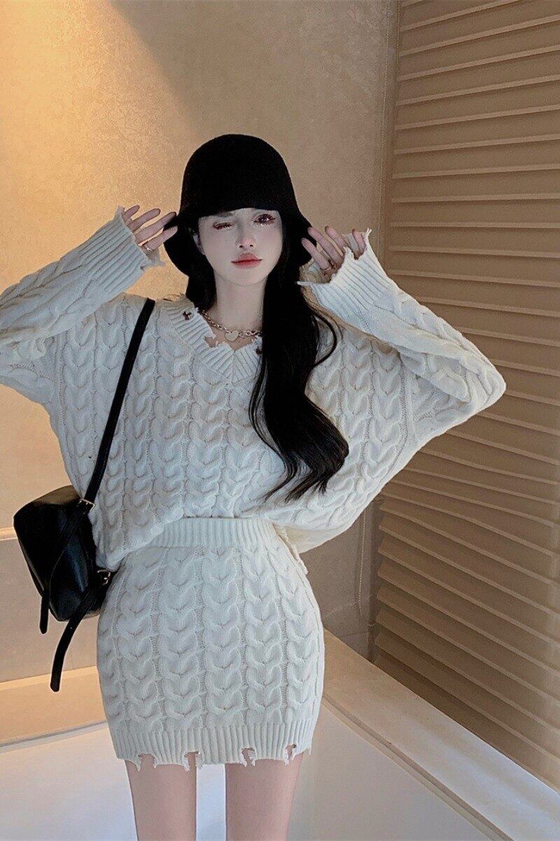 Sweet Girl Style Vネック 長袖 セーター レディース 秋冬 ゆったり 厚手 ニット プルオーバー ミニスカート 2点セット ロング 大人ガーリー スウィート キュート カジュアル オータム 秋物 ウィンター 冬物 got35350105203