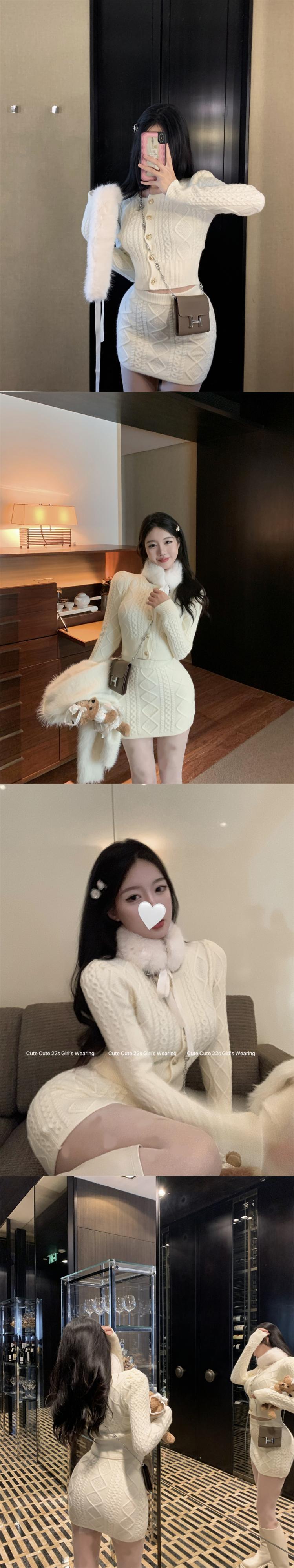 スウィートガールニットスーツ女性の肥厚ツイストセーターと毛皮の襟ウエストスカート 2 点セット服 大人ガーリー キュート カジュアル got25448364955