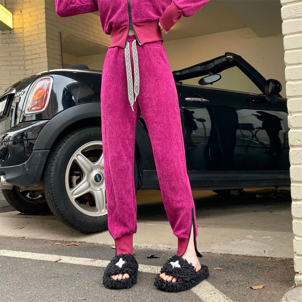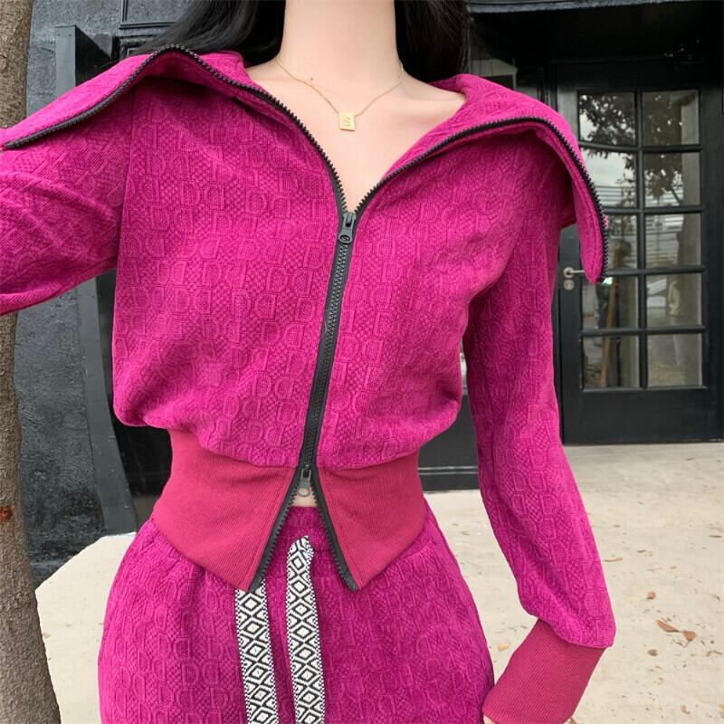 厚めの折り襟長袖ダブルジッパーショートコートウエスト巾着パンツレディースツーピースセット ロング got6342030502