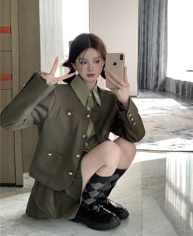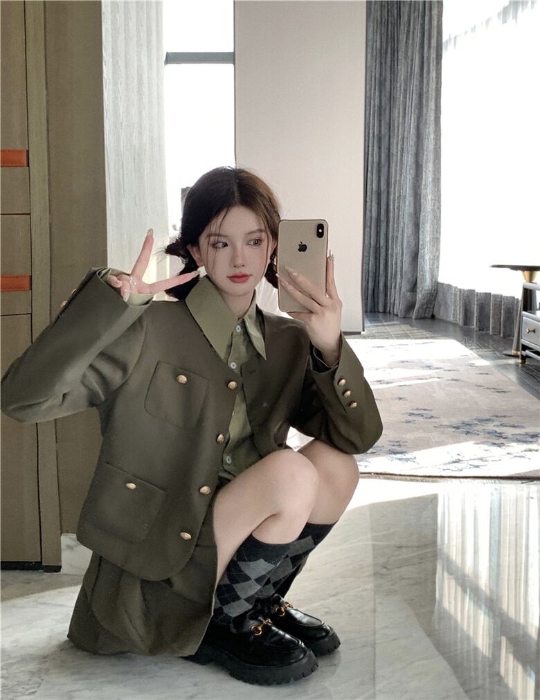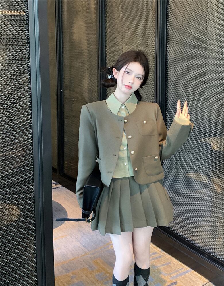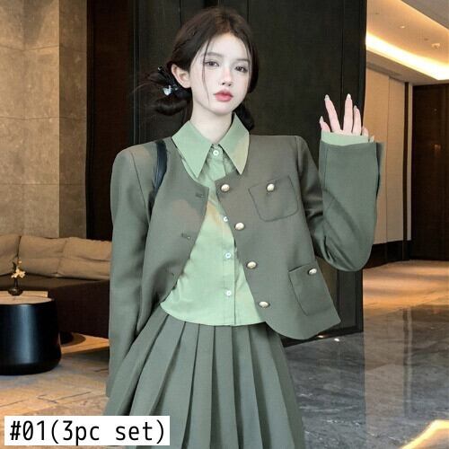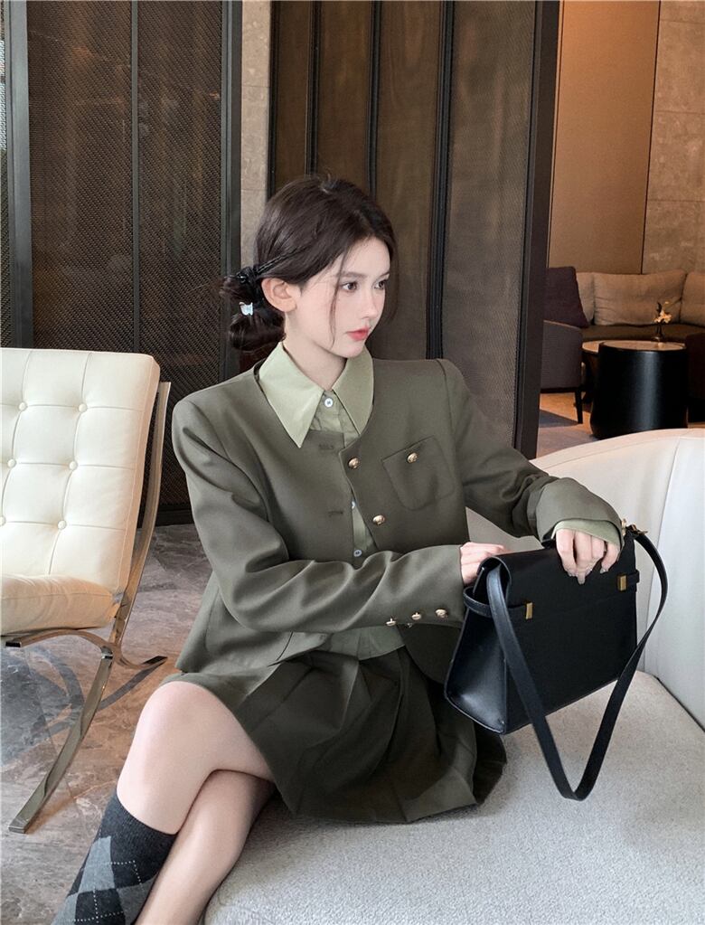 秋冬のスーツスタイル 肩パットスーツ コート プリーツスカート 長袖シャツ 3点セット ロング オータム 秋物 ウィンター 冬物 got44640409176