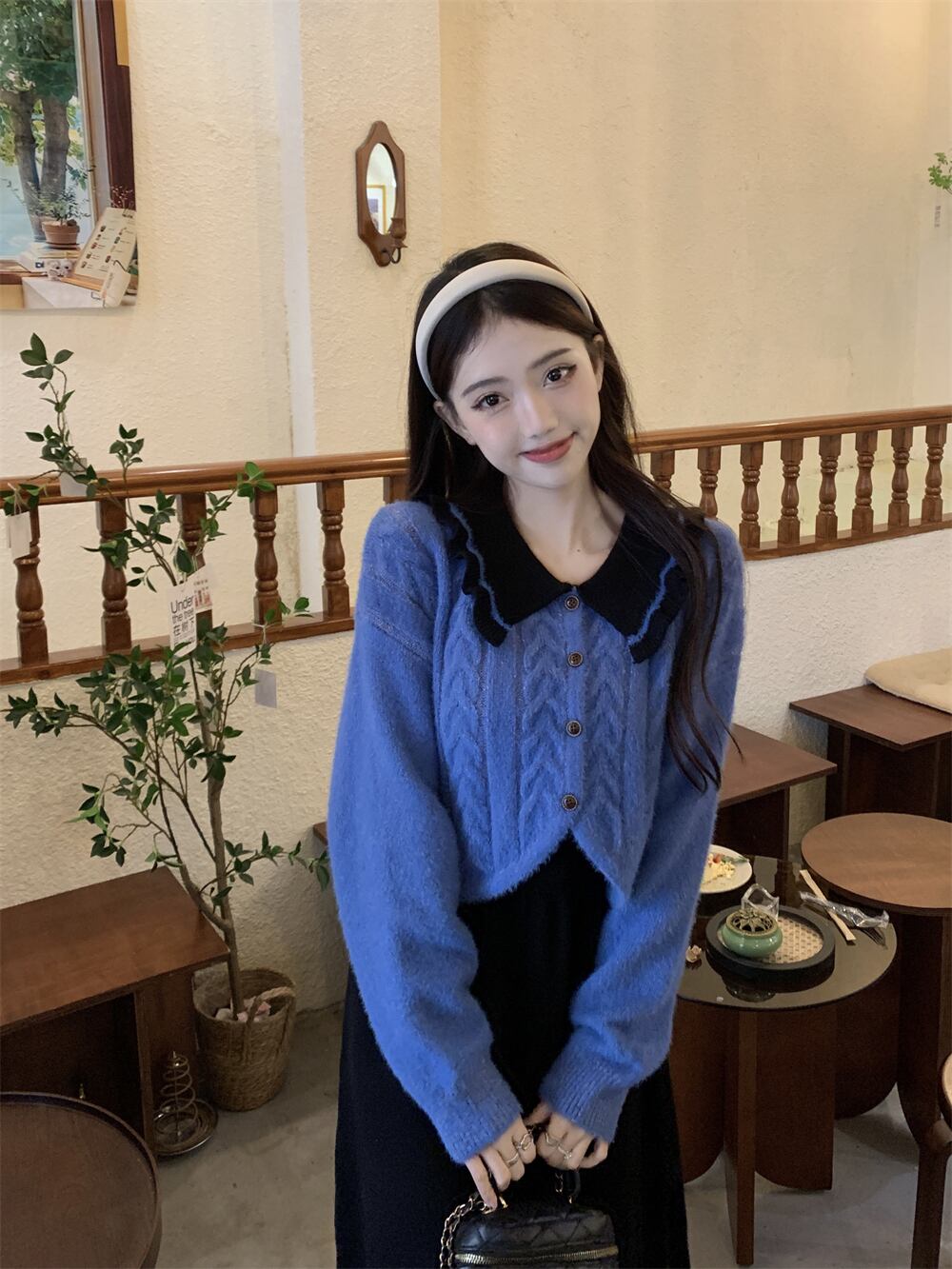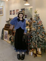 スウィートガールスーツレディースブルー長袖ショートセーターカーディガン秋冬スリムニットスリングAラインドレスツーピースセット ロング 大人ガーリー キュート カジュアル オータム 秋物 ウィンター 冬物 got49916805343