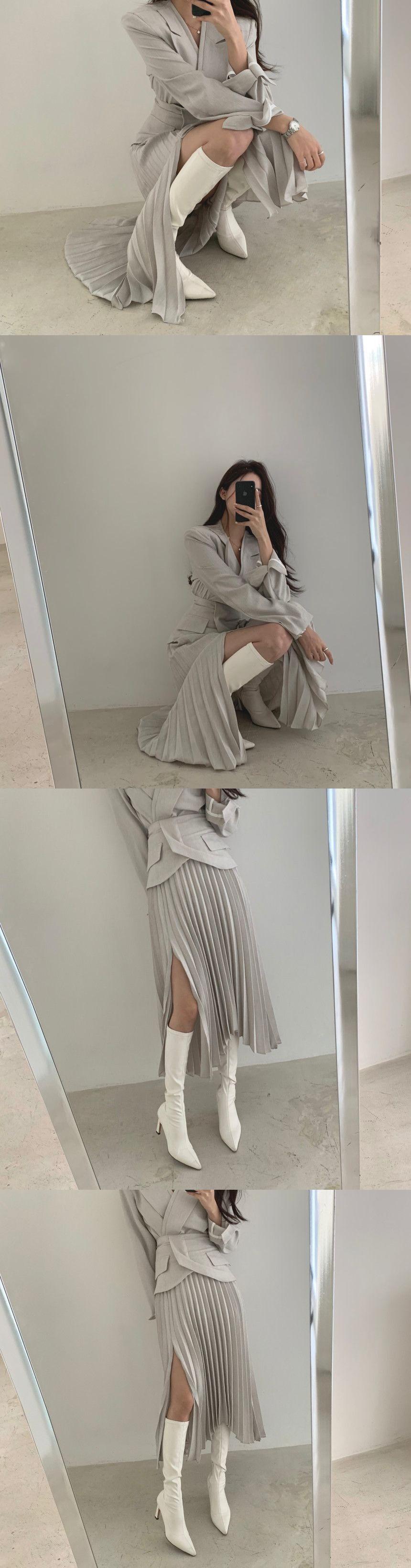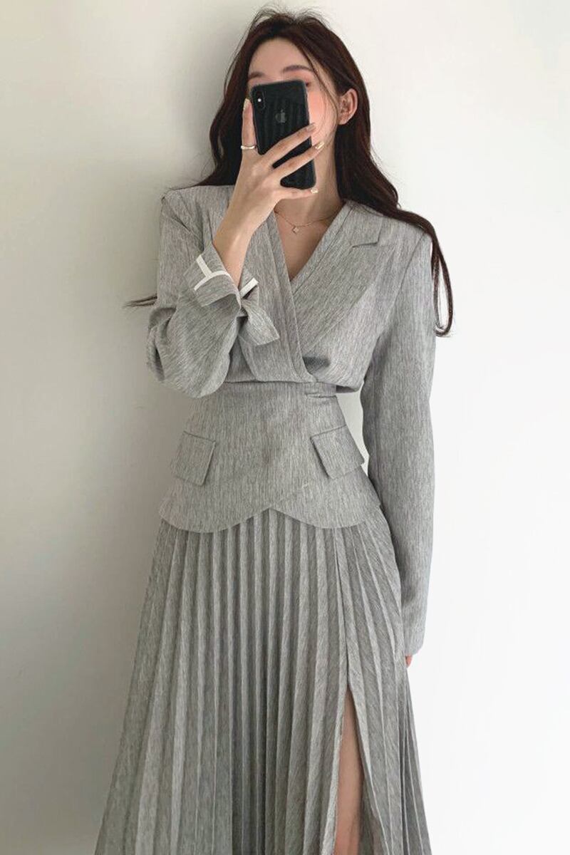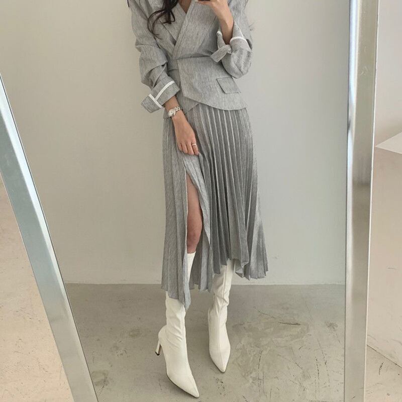Style OLスーツ 気質 ターンダウンカラー スリム 長袖 コート ウエストスリット プリーツスカート 2点セット ロング 会社 学校 通勤や通学にも got78973360999