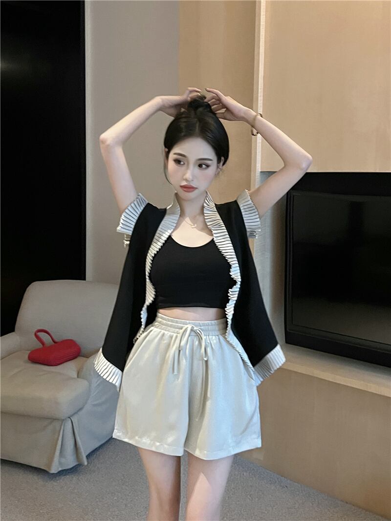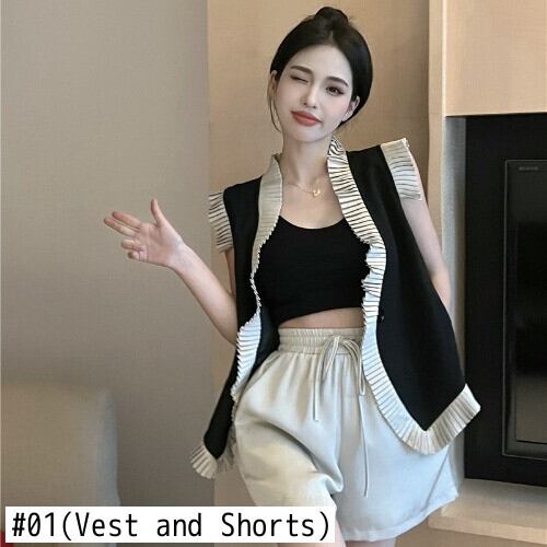 スタイルショーツツーピーススーツ夏プレスプリーツ菌エッジコントラストベスト + ウエストワイドレッグショーツ女性 サマー 夏物 ブルマー ワイドパンツ got79508961837