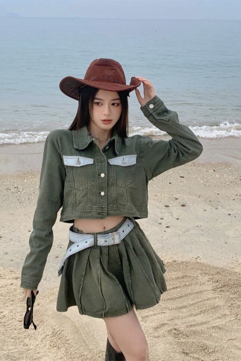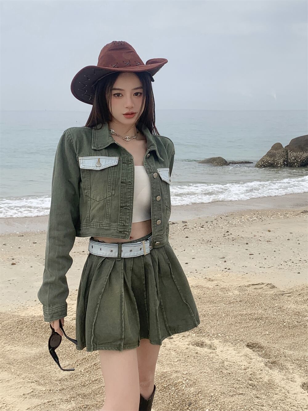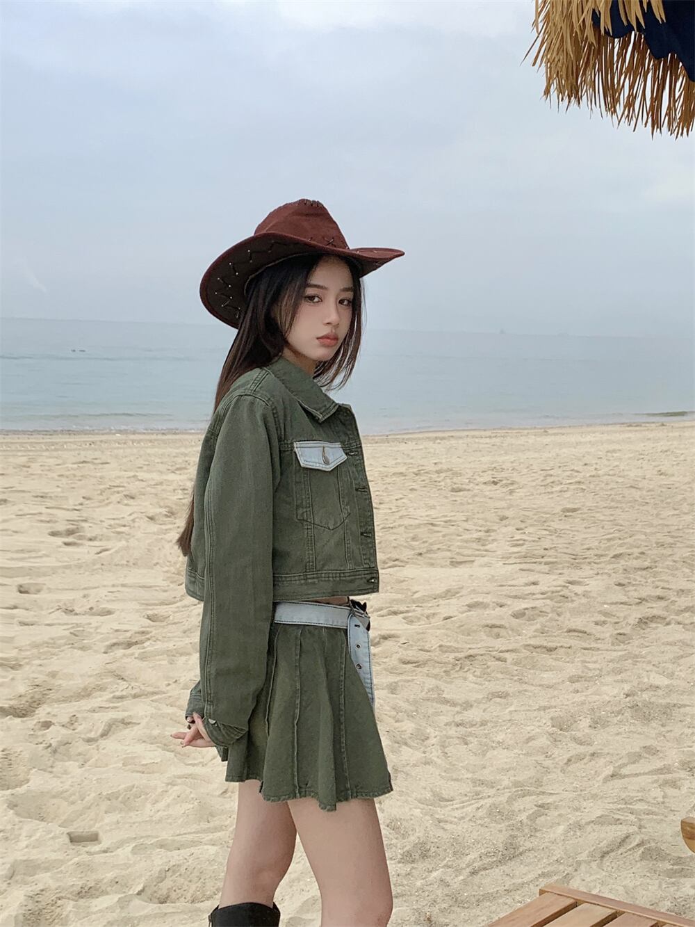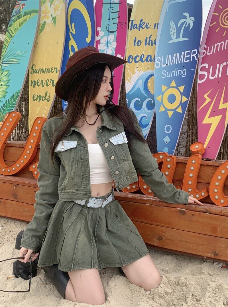 レトロなシックなスタイルの色のコントラストのスーツの女性の春カーゴ デニム ジャケット プリーツ スカート 2 点セット服 スプリング 春物 got81178854047