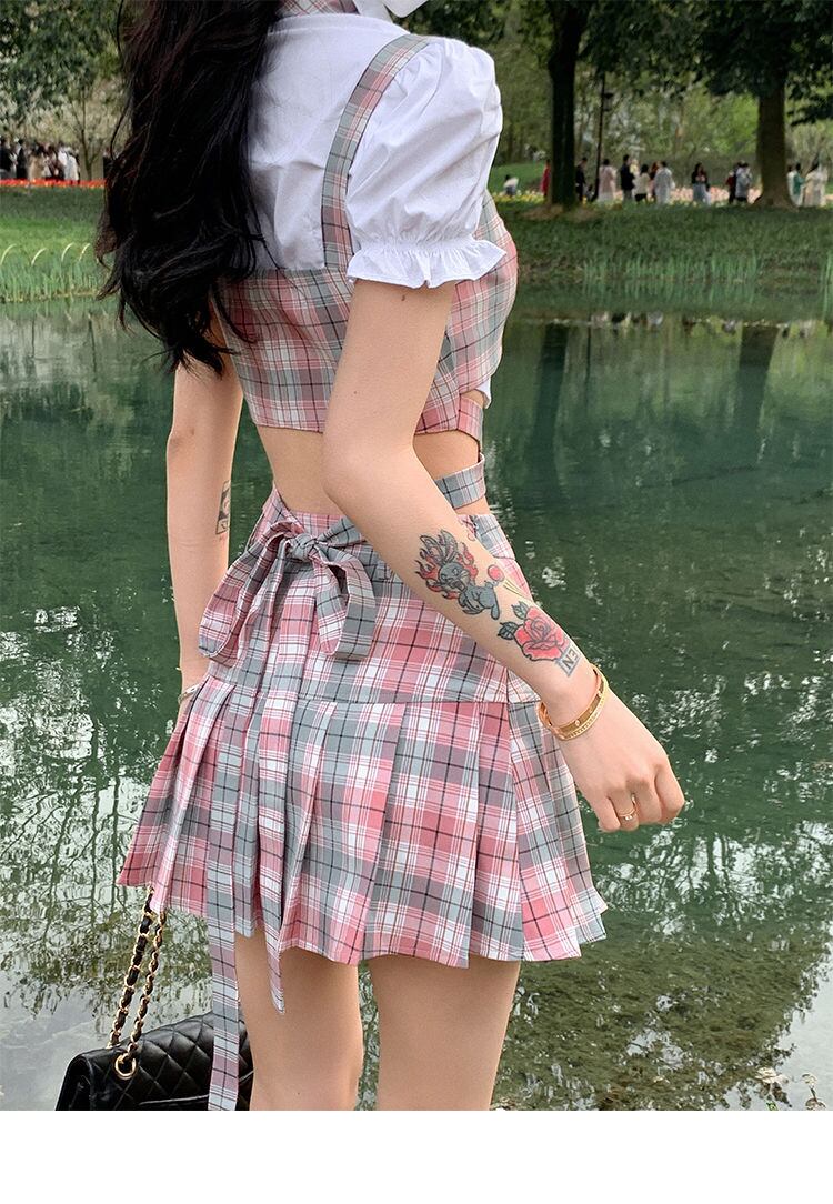 Gothiscyn 女性スーツセクシーな 3 点セットピンクの格子縞のタンクベスト + クロップシャツ + スカートスーツパーティーガールシックなスーツ got40076238690