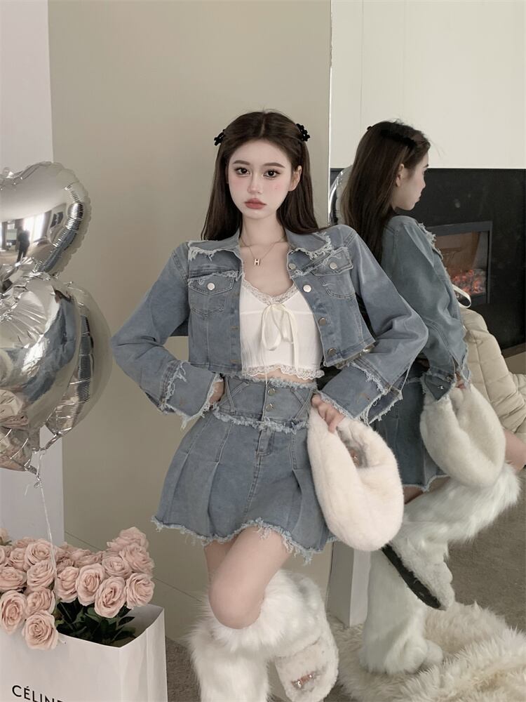 スイートクールホットガールスーツ女性のウォッシュド生エッジデニムショートコートウエストスリムプリーツショートスカートツーピースセット 大人ガーリー スウィート キュート カジュアル got63198494640