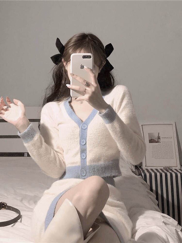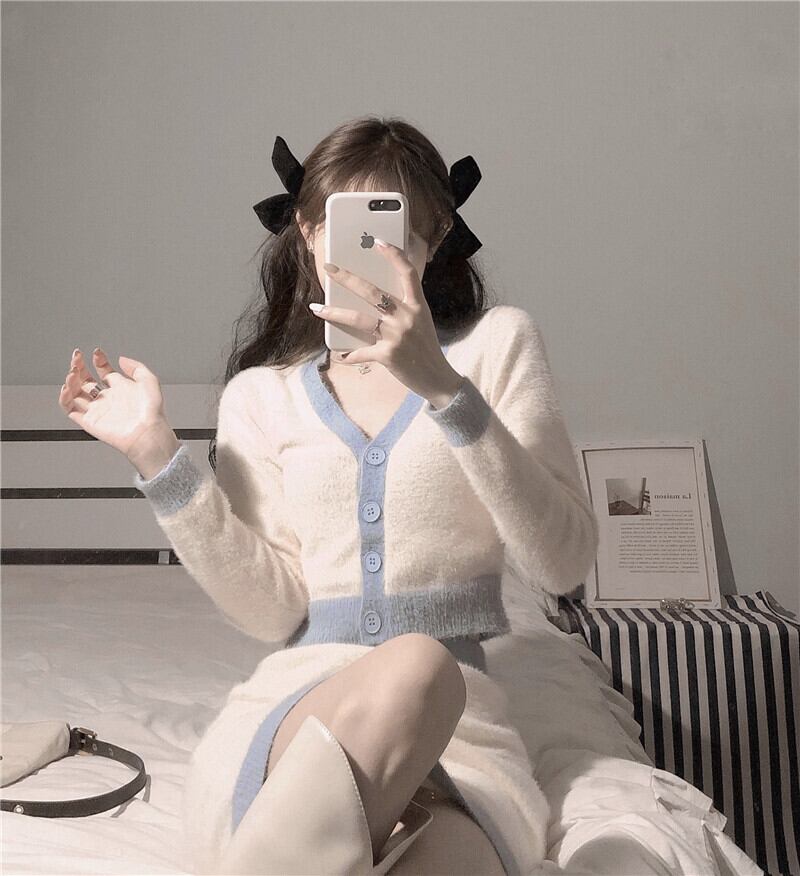 ツーピースセット衣装モヘアスーツショートニットセーターウエストラップスカート甘い女性セットvネック梨花服セット 大人ガーリー スウィート キュート カジュアル got17644064226